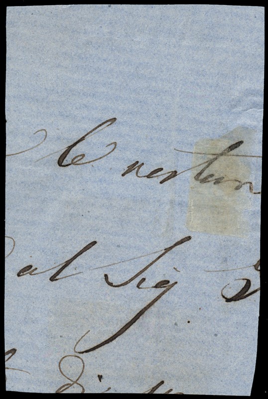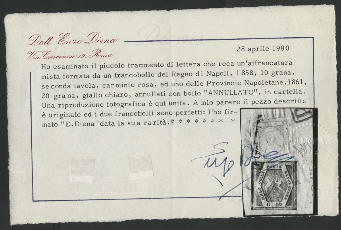 1861 - 20gr giallo in affrancatura mista con Regno di Napoli, 10gr carminio rosa II tavola; su frammento 'ANNULLATO' in cartella. CF E.Diena (Sassone 11+23 - Euro 13.750++)