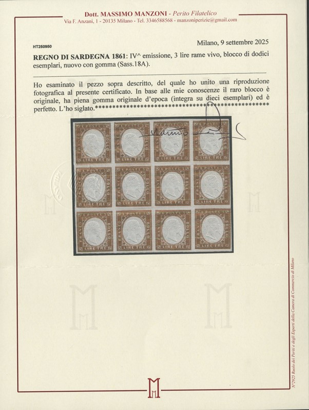 1861 - 3L rame vivo, blocco di 12 di cui 10 SL. Raro e molto fresco. Sigle E.Diena, CF Manzoni (Sassone 18A - Euro 19.200+)