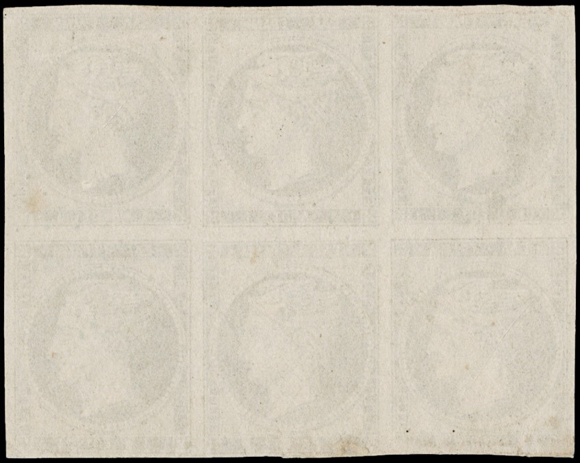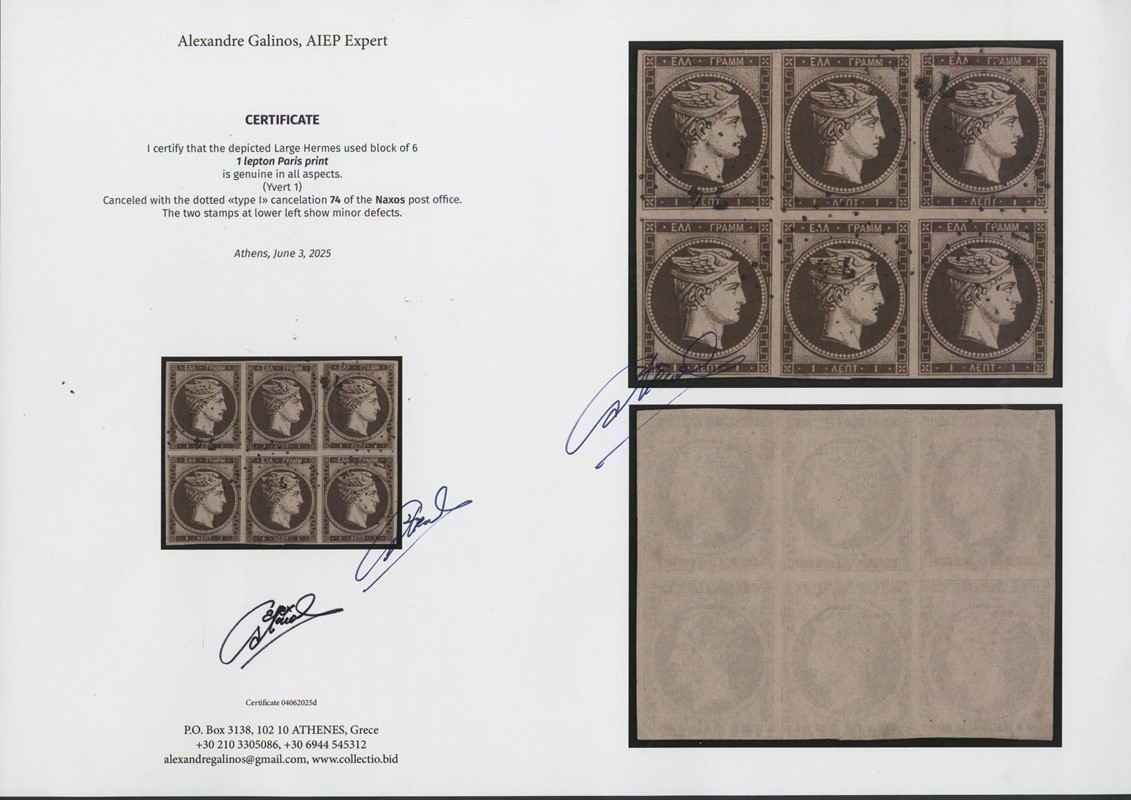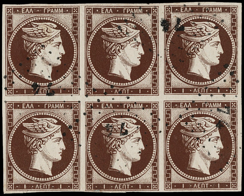 1861 - Grandi teste di Hermes, 1 lepton cioccolato scuro, tiratura di Parigi, BL6 annullato numerale a punti '74' di Naxos. Minimi difetti sugli ultimi due esemplari in basso, comunque raro. CF Galinos (Yvert 1 - Euro 11.000*1,5 / Hellas 1 - Euro 9.300x1,5)
