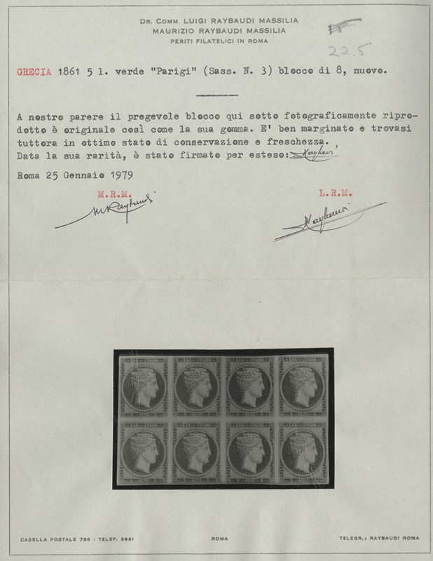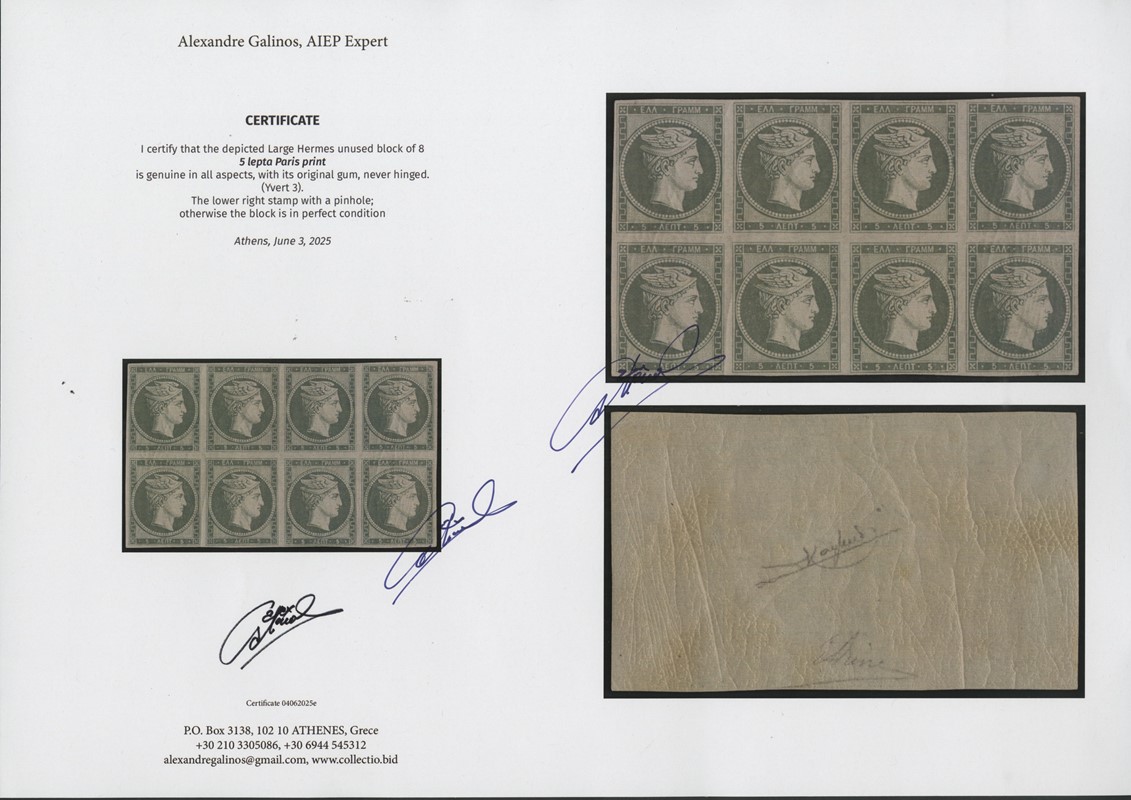 1861 - Grandi teste di Hermes, 5 lepta verde, tiratura di Parigi, BL8 nuovo, quattro esemplari SL. Freschissimo e splendido. CF Galinos e Raybaudi Massilia (Yvert 3 - Euro 5.800x2++ / Hellas 3 - Euro 6.800x2++)