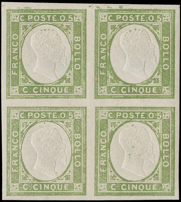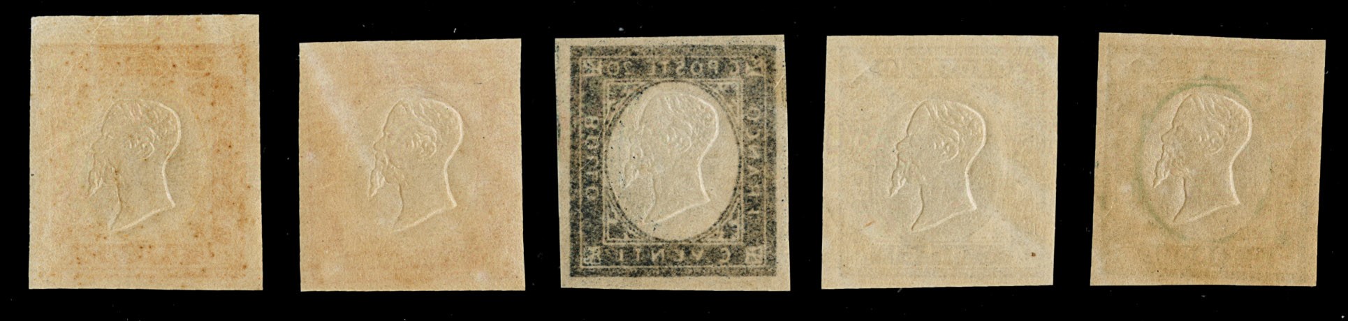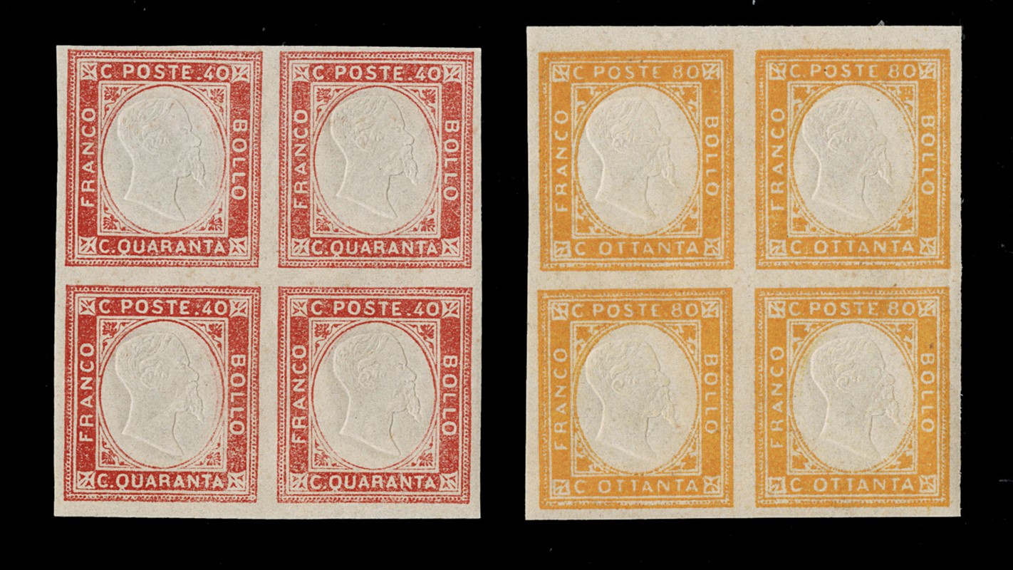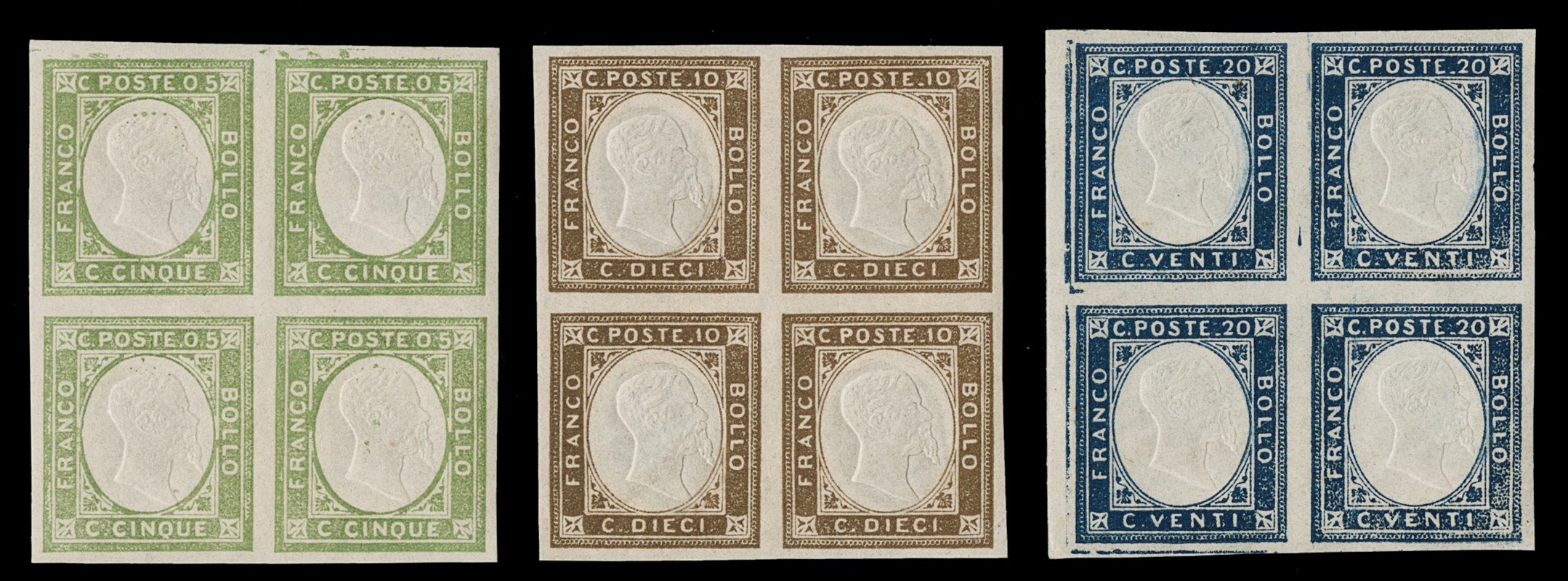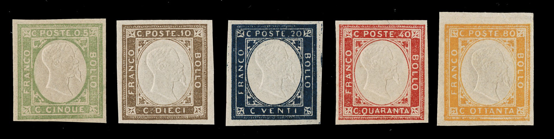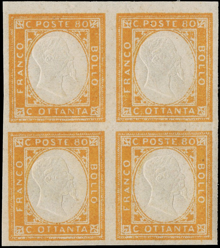 1861 - Non emessi, i cinque valori singoli e in BL4, tutti SL. CF Bolaffi 100% per l'80c arancio e 70% per i BL4 (Sassone 1/5 - Euro 4.300)