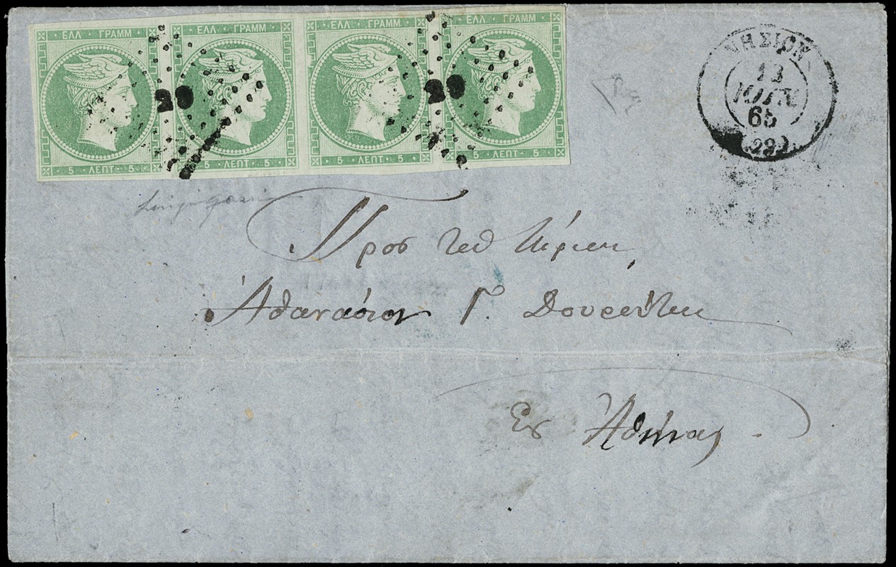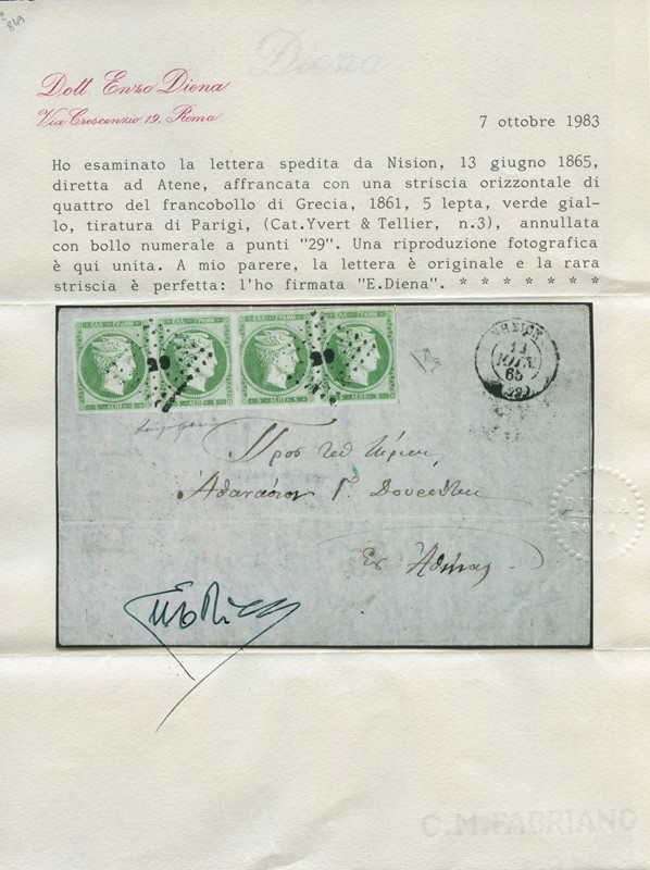 1861/65 - Grandi teste di Hermes, tiratura di Parigi: 5 lepta verde giallo, ST4 orizzontale annullata numerale a punti 29 da 'NISION 13 giugno 1865' per Atene. Interessante uso tardivo (Yvert 3 / Hellas 3 - R come striscia)