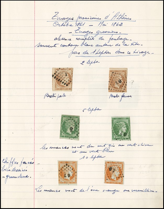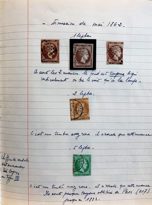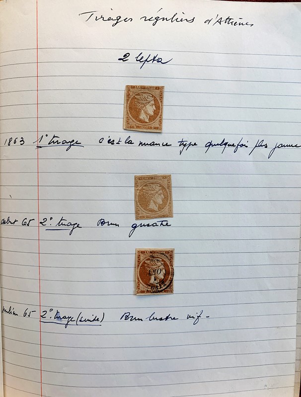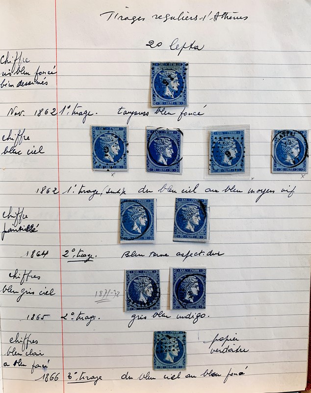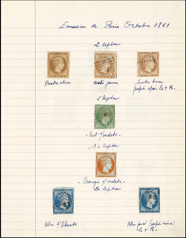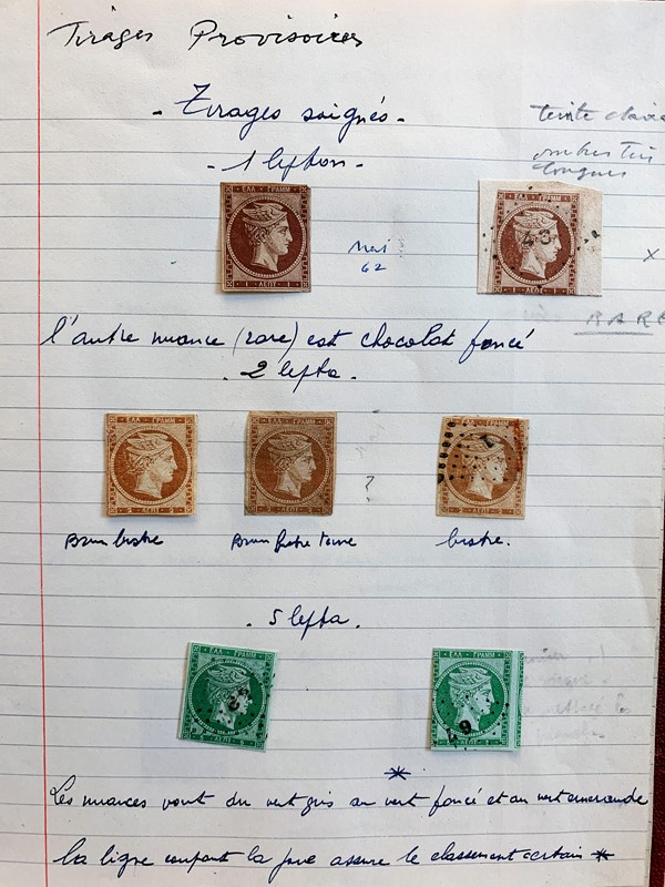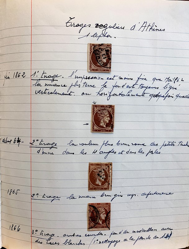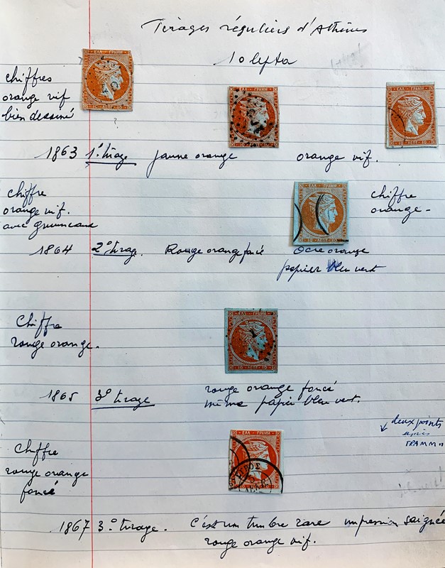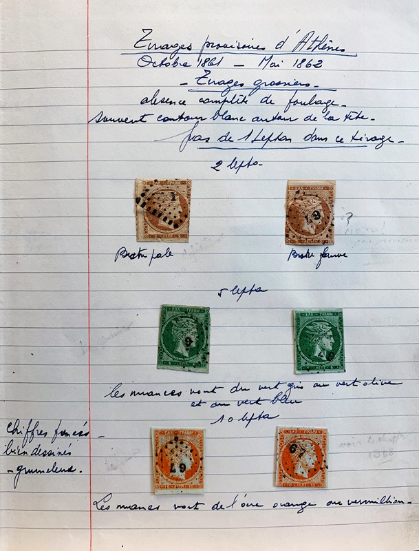 1861/80 - GRECIA: Grandi teste di Hermes, quida per la classificazione delle teste di Hermes, composta da insieme di numerosi esemplari (per lo piu' difettosi) delle diverse tirature e di diverse tinte, con spiegazioni e informazioni in francese, raccolti in un quaderno. Lotto estremamente interessante