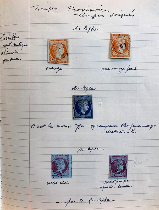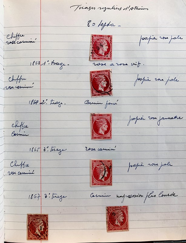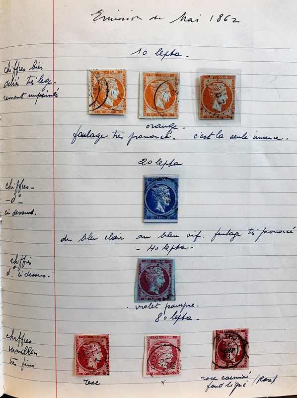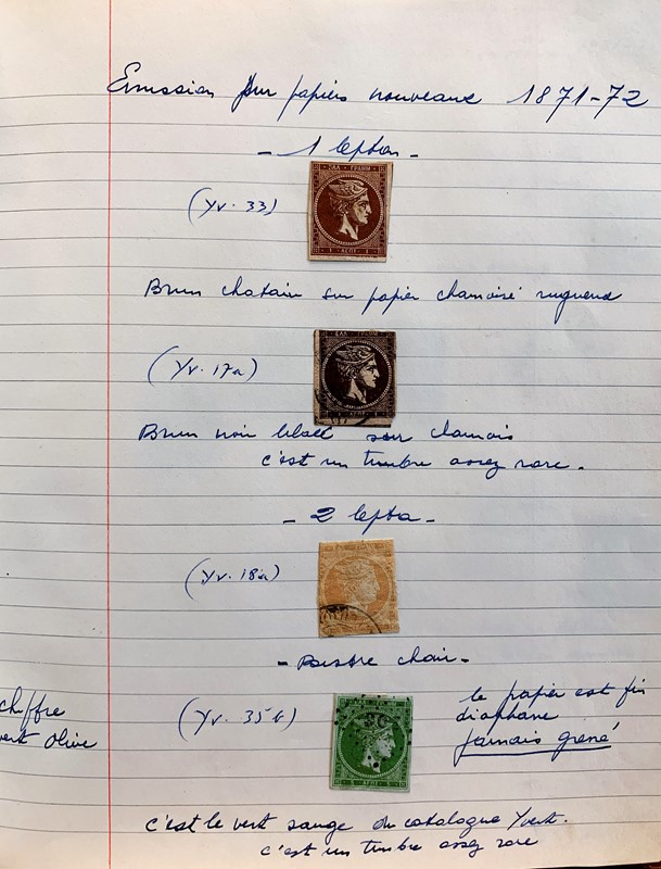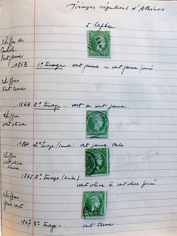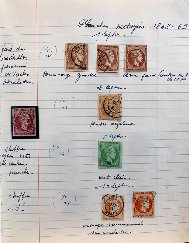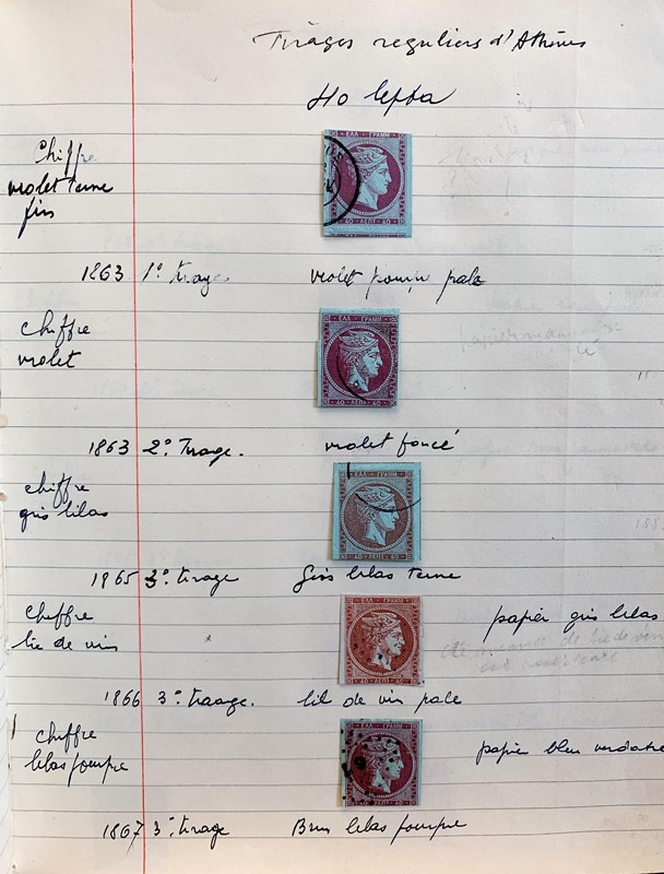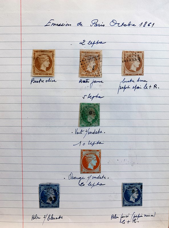1861/80 - GRECIA: Grandi teste di Hermes, quida per la classificazione delle teste di Hermes, composta da insieme di numerosi esemplari (per lo piu' difettosi) delle diverse tirature e di diverse tinte, con spiegazioni e informazioni in francese, raccolti in un quaderno. Lotto estremamente interessante