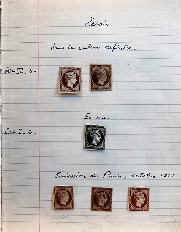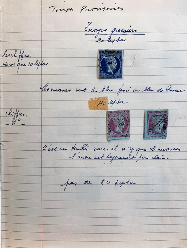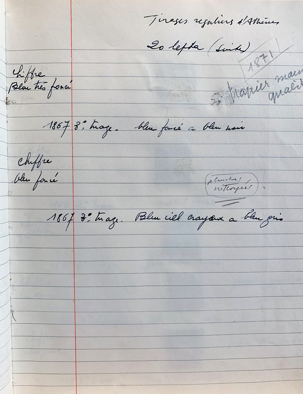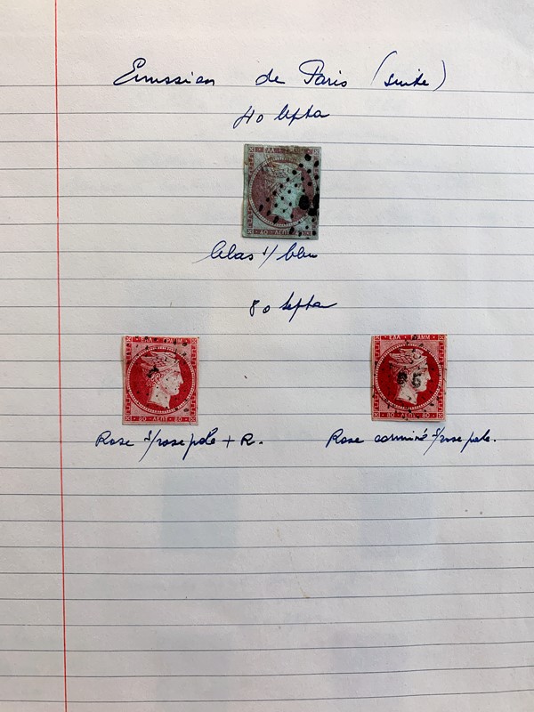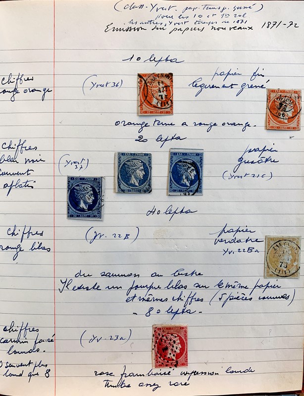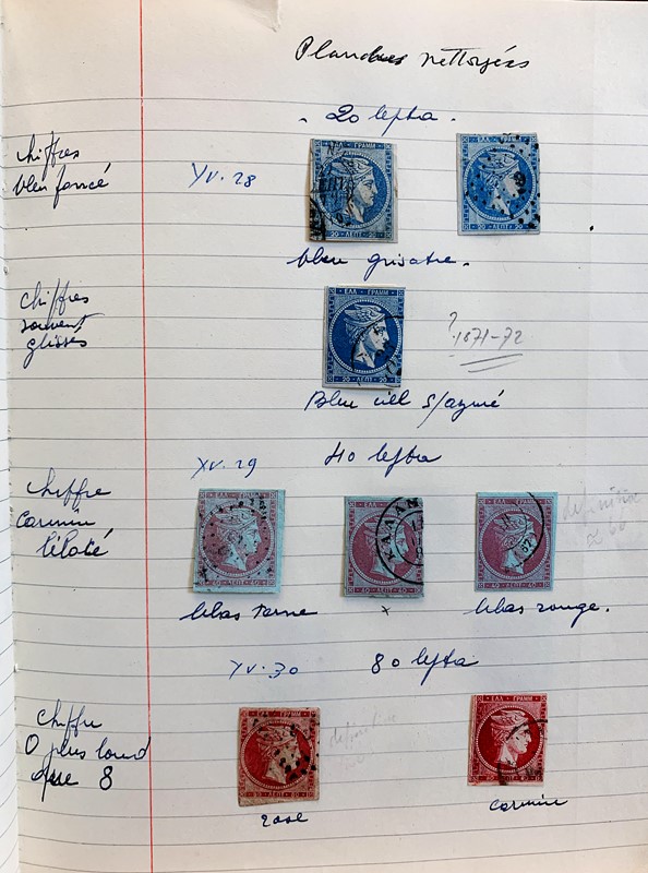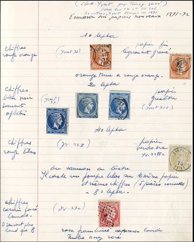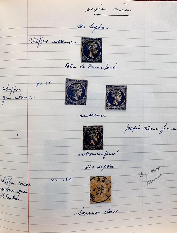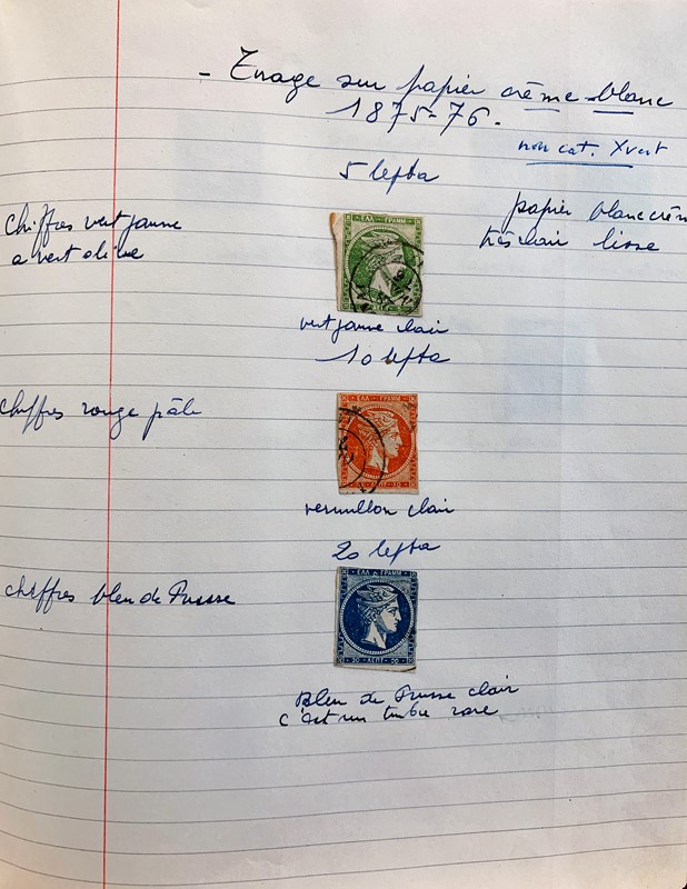 1861/80 - GRECIA: Grandi teste di Hermes, quida per la classificazione delle teste di Hermes, composta da insieme di numerosi esemplari (per lo piu' difettosi) delle diverse tirature e di diverse tinte, con spiegazioni e informazioni in francese, raccolti in un quaderno. Lotto estremamente interessante