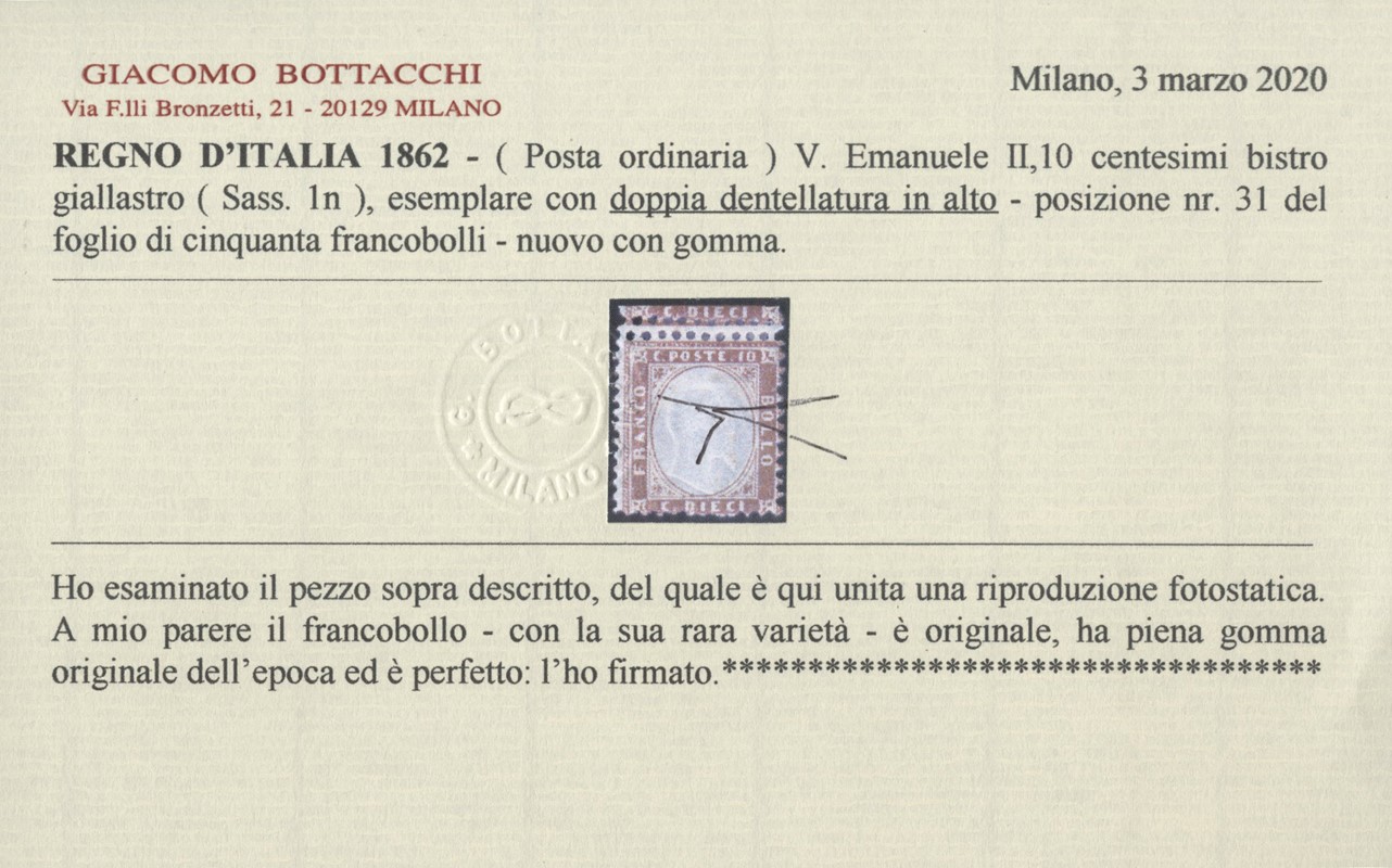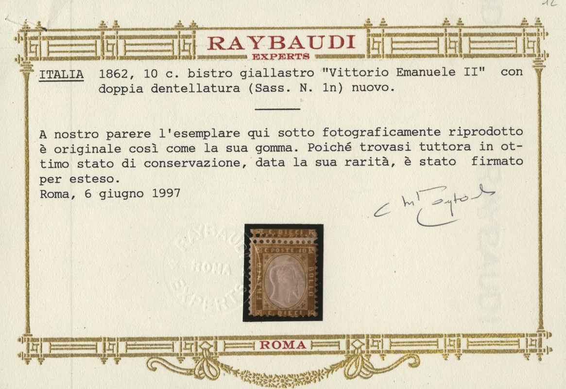 1862 - 10c bistro giallastro con doppia dentellatura. Qualche dente arrotondato, comunque molto fresco e raro. Firme G.Bolaffi, Oliva, A.Diena, CF Bottacchi e Raybaudi oro (Sassone 1n - Euro 20.000)