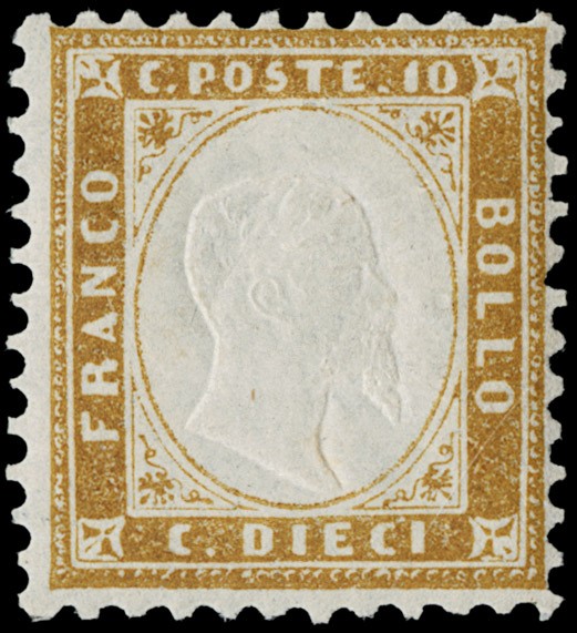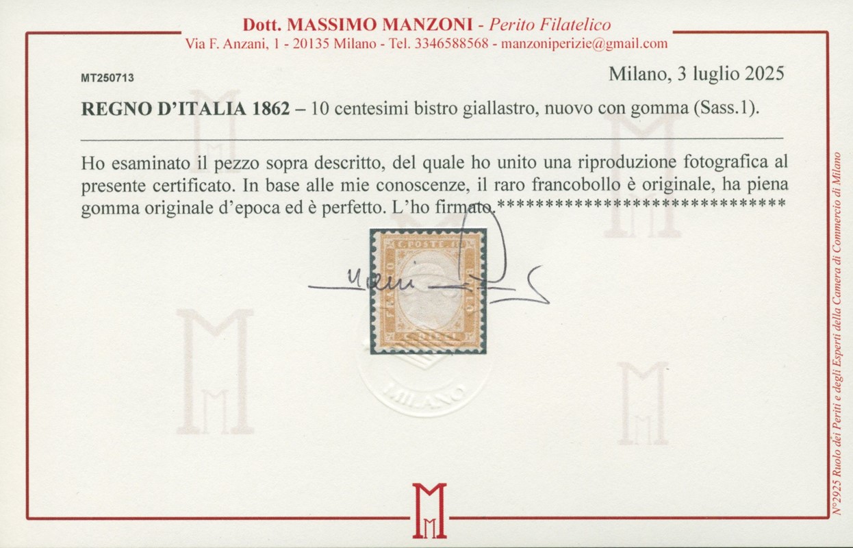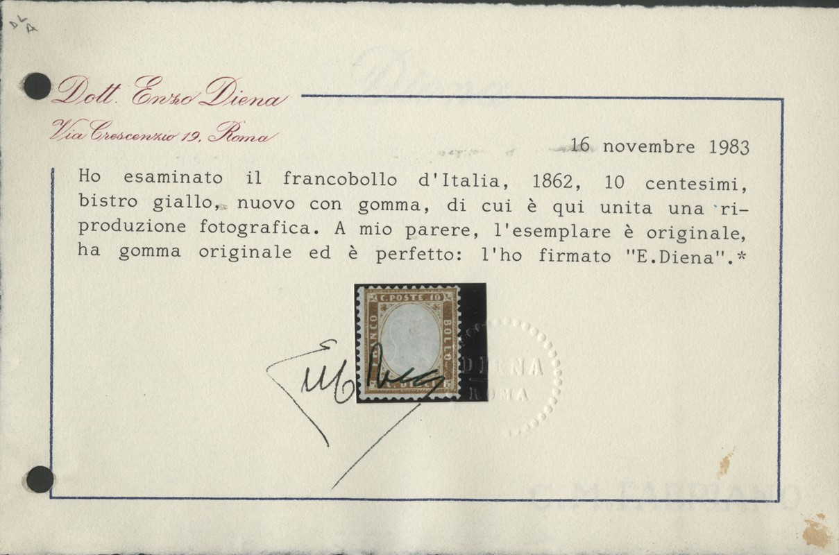 1862 - 10c bistro giallastro, discreta/buona centratura. Firme A.Diena e Giulio Bolaffi, CF E.Diena e Manzoni (Sassone 1 - Euro 16.000)