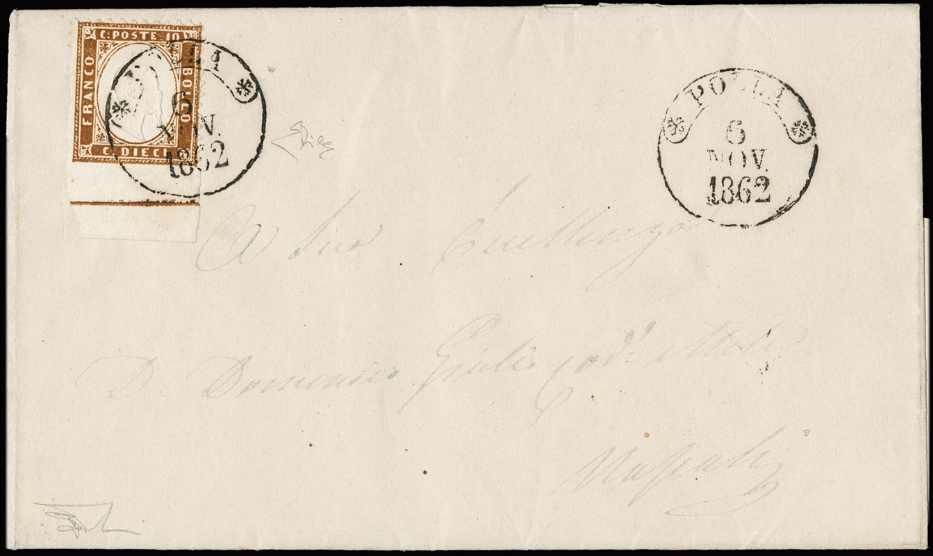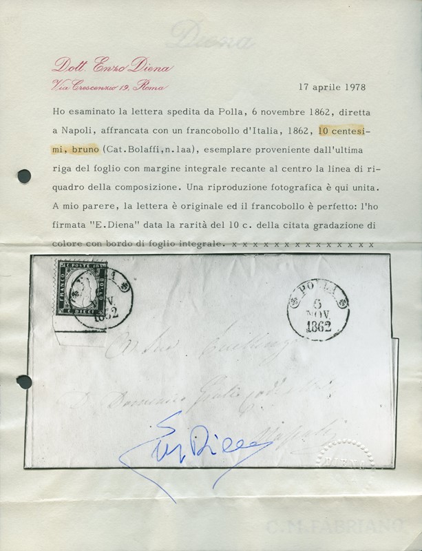 1862 - 10c bruno scuro BdF inferiore con riga di colore da 'POLLA 6 NOV. 1862' a Napoli. Raro, CF E.Diena (Sassone 1dl - Euro 36.000x3)