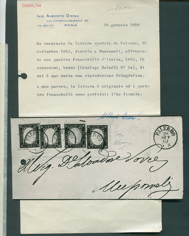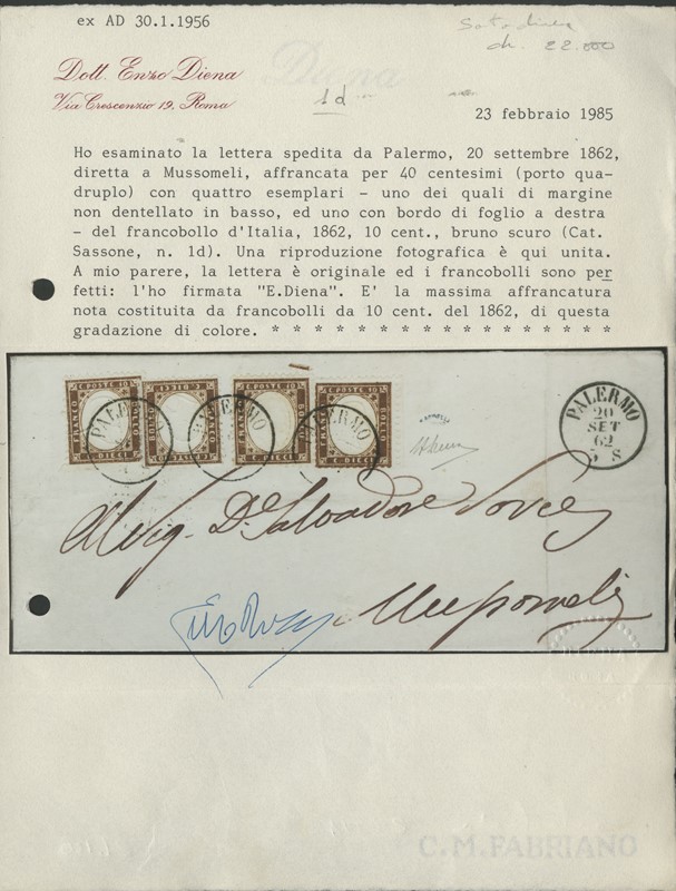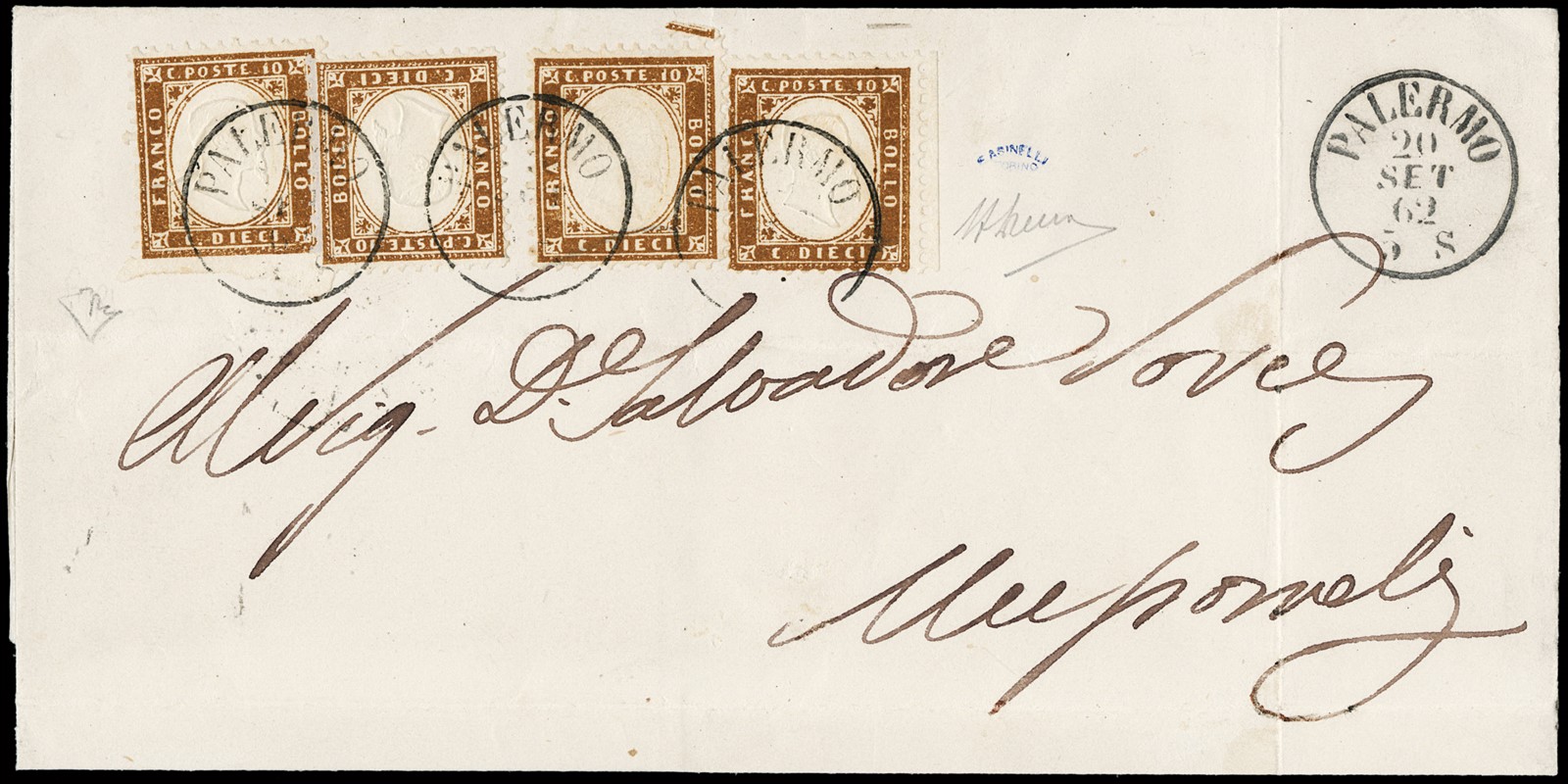 1862 - 10c bruno scuro, quattro esemplari (uno BdF non dentellato in basso e un altro BdF a destra) da 'PALERMO 20 SET 62' a Mussomeli. Affrancatura di quadruplo porto, molto probabilmente il multiplo piu' importante del 10c bruno scuro. CF A. ed E.Diena