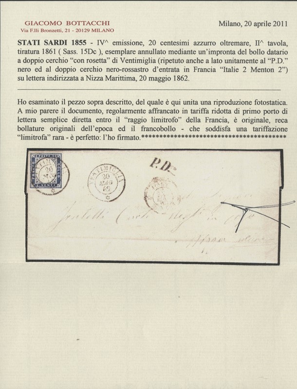 1862 - 20c azzurro oltremare II tav, tir.61 da 'VENTIMIGLIA 20 MAG 62' a Nizza in tariffa di raggio limitrofo per la Francia. CF Bottacchi (Sassone 15Dc - Euro -)
