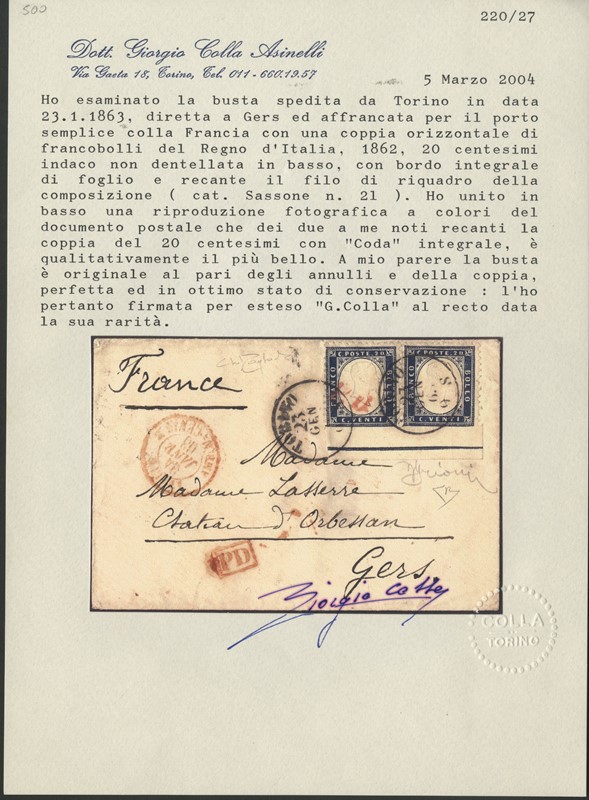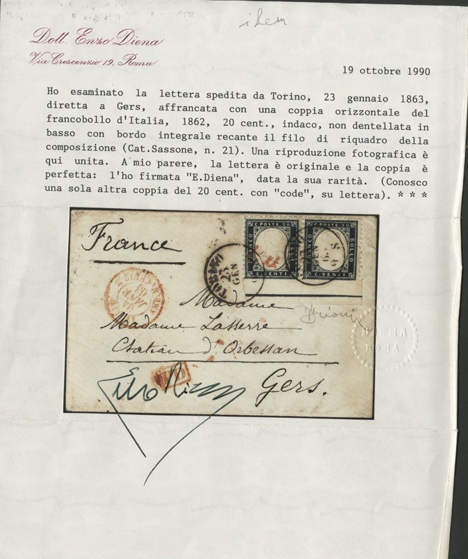 1862 - 20c indaco, coppia BdF non dentellata in basso con bordo integrale e linea di riquadro nel margine inferiore, da 'TORINO 23 GEN 63' a Gers. Rarissimo, E.Diena 'conosco una sola altra coppia del 20c con 'Code' su lettera'. Firma Grioni, CF Colla ed