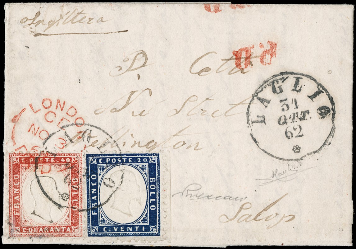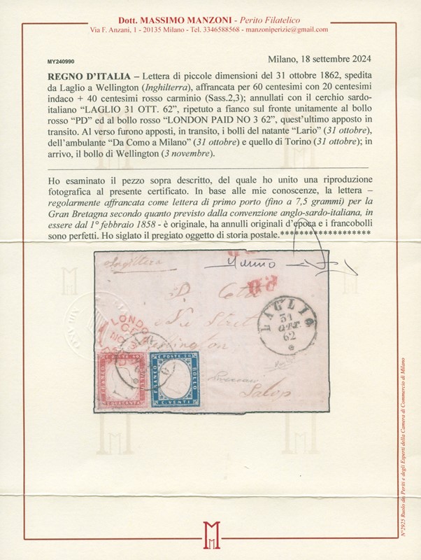 1862 - 20c indaco e 40c rosso carminio da 'LAGLIO 31 OTT 62' (CO) a Wellington (Salop / Inghilterra). Splendida lettera di piccole dimensioni. Firme Luigi Raybaudi e Vaccari. CF Manzoni (Sassone 2+3, Zanaria/Serra 1.000+pt.11 Euro 4.500+ - Euro 5.500+)