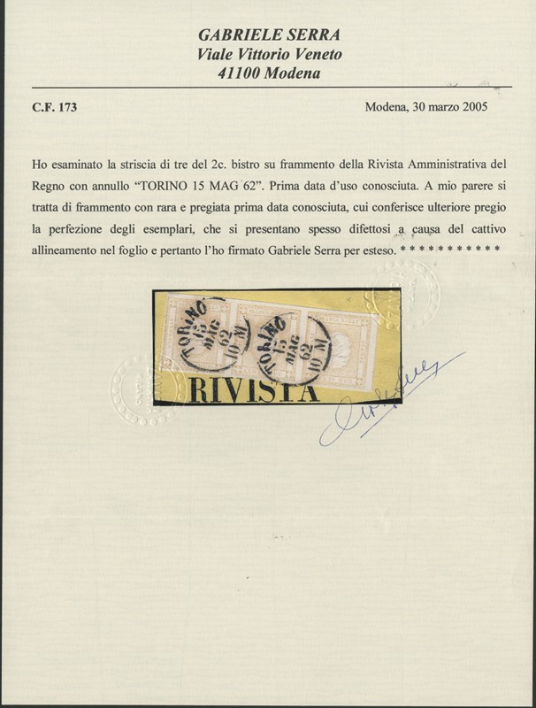 1862 - 2c bistro, striscia orizzontale di tre 'TORINO 15 MAG 62', prima data nota. CF Gabriele Serra (Sassone 10 - Euro - )