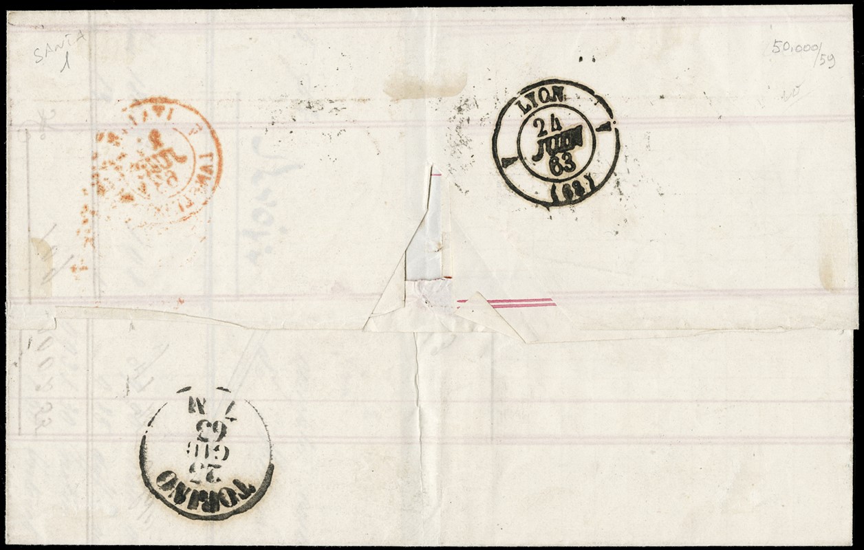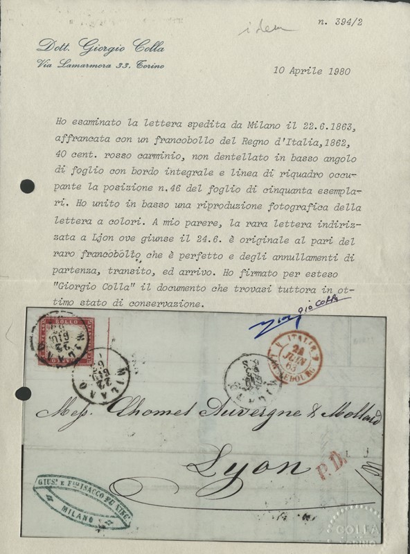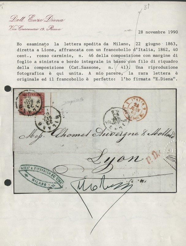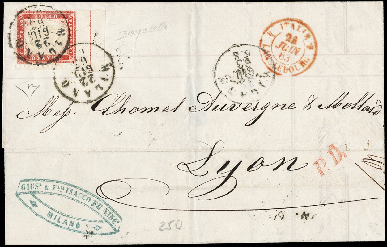 1862 - 40c rosso carminio AdF inferiore sinistro, pos.46, con bordo integrale in basso e linea di riquadro nel margine, da 'MILANO 22 GIU 63' a Lione. CF Colla ed E.Diena (Sassone 3l - Euro 45.000+)