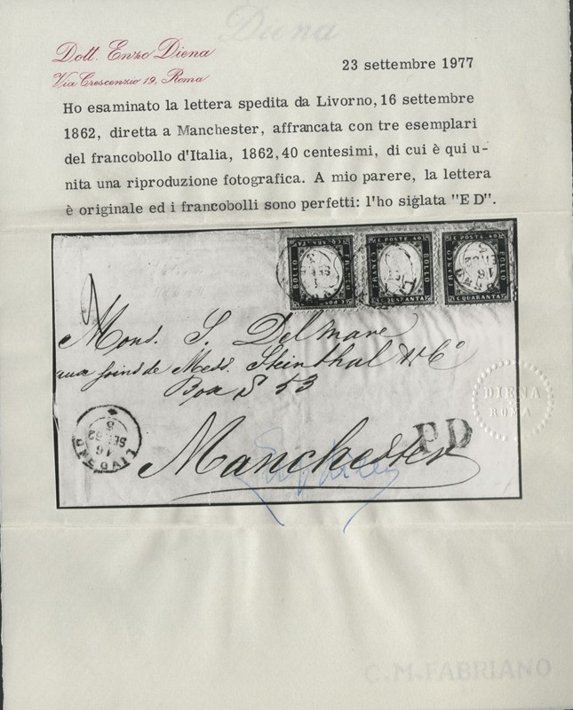 1862 - 40c rosso carminio scuro, tre esemplari da 'LIVORNO 16 SET 62' a Manchester. CF E.Diena e Gabriele Serra (Sassone 3a - Euro 27.500++)
