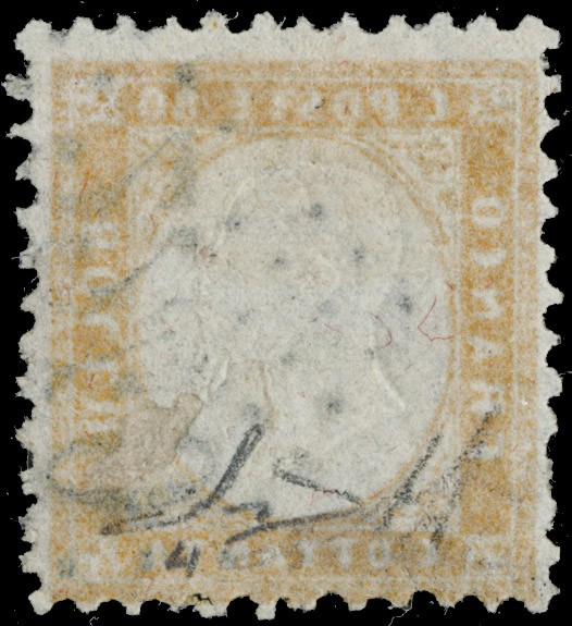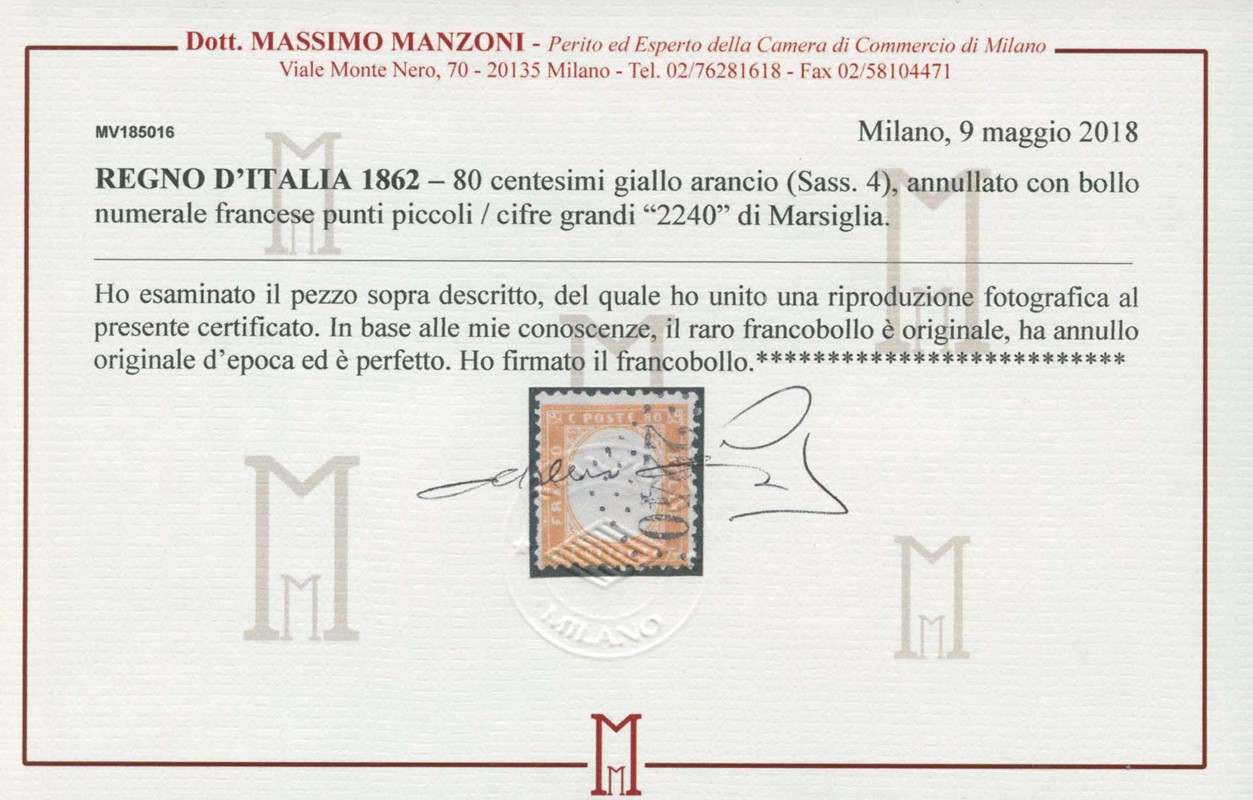 1862 - 80c giallo arancio, annullato numerale francese grandi cifre '2240' di Marsiglia. Molto raro. Sigla A.Diena, CF Manzoni (Sassone 4+pt.R1 - Euro 8.000)