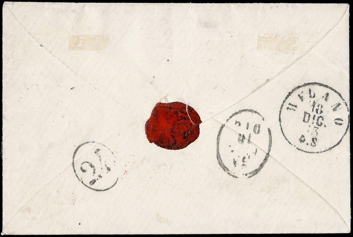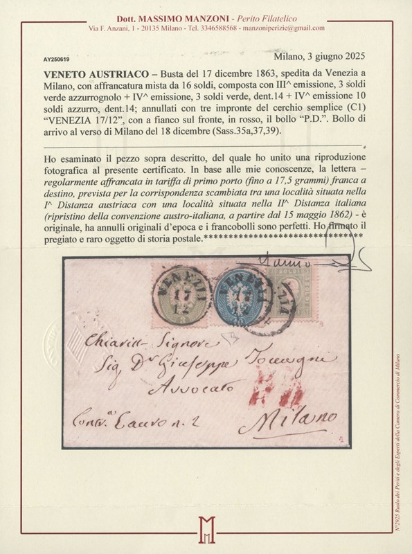 1862 - III emissione 3s verde giallo con IV emissione 3s verde e 10s azzurro da 'VENEZIA 17/12' a Milano. Splendida tricolore con valori gemelli testine e aquilette. Firma E.Diena, CF Manzoni (Sassone 35+37+39 - Euro -)