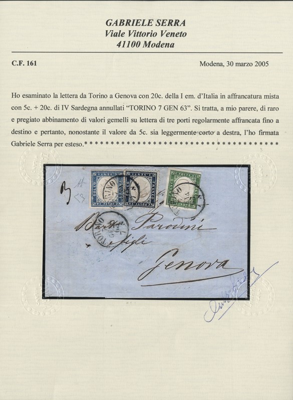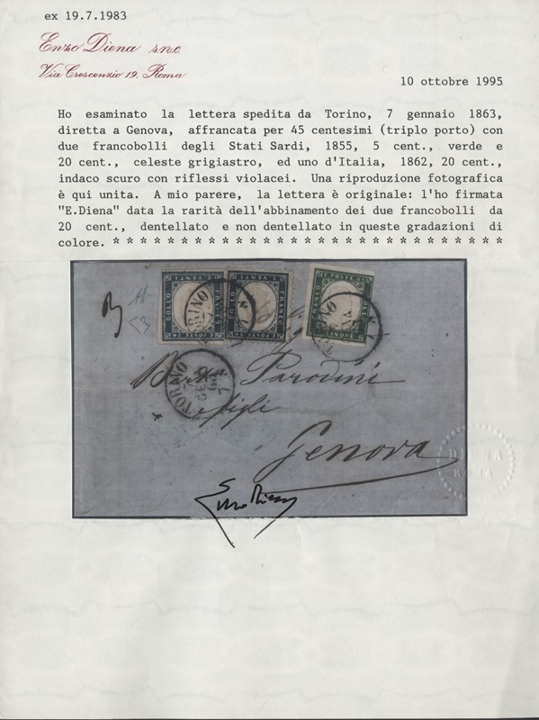 1862 - Regno d'Italia 20c indaco con Sardegna IV emissione 5c verde scuro, IV tav, tir.62 (sfiorato a destra) e 20c celeste grigiastro, II tav, tir.61, da 'TORINO 7 GEN 63' a Genova. Rara mista 'valori gemelli'. Firma A.Diena, CF E.Diena e Gabriele Serra. (Sassone 2 + Sard.13D+15Db - Euro - )