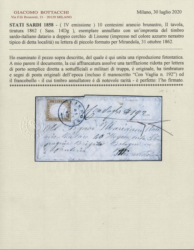 1862 - Sardegna 10c arancio brunastro, uso isolato in tariffa ridotta per militari su lettera di piccolo formato da 'LISSONE 31 OTT. 62' (datario a doppio cerchio azzurro nerastro sardo-italiano) per Mirandola. CF Bottacchi (Sassone 14Dg - Euro 12.000++)