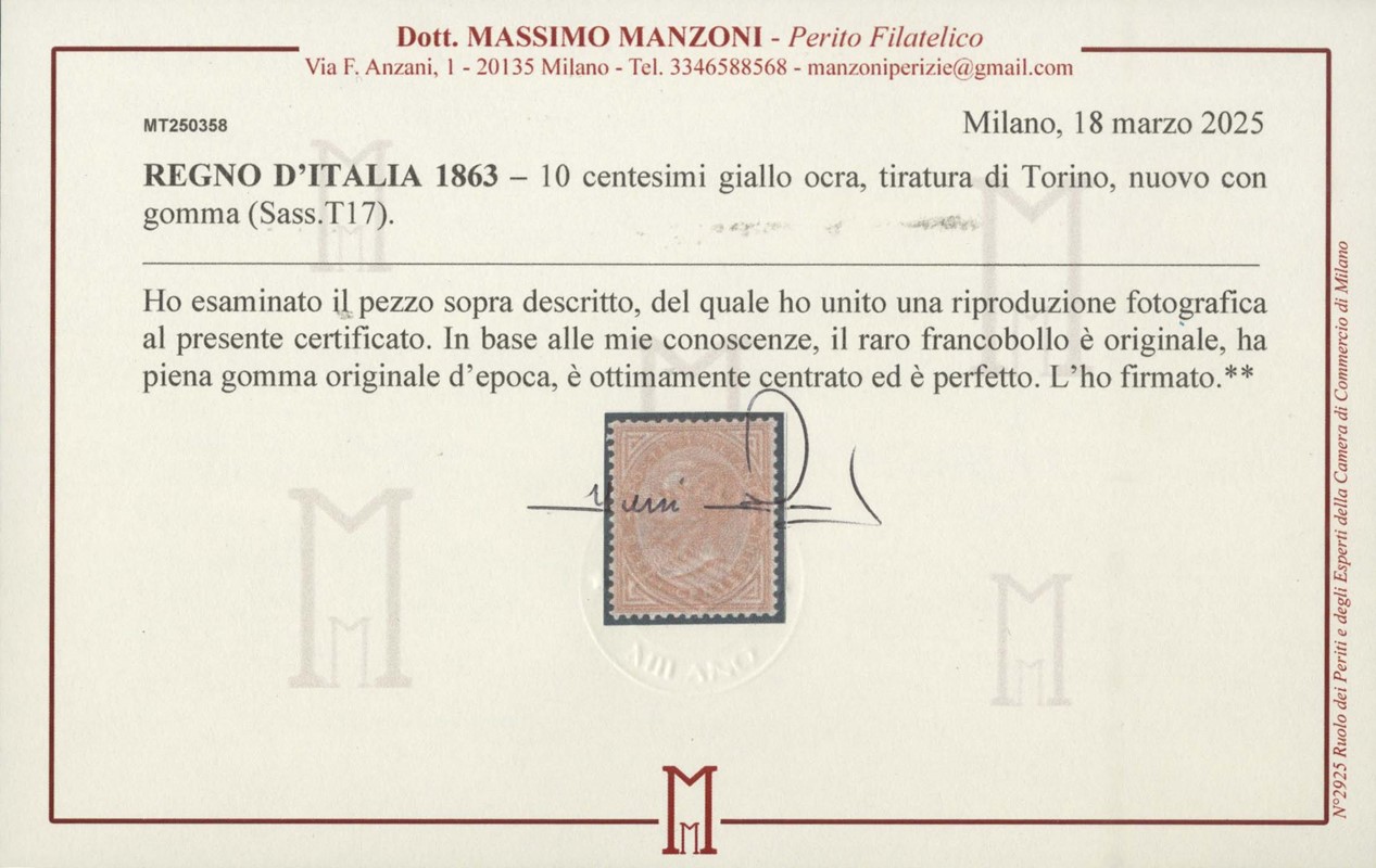 1863 - 10c giallo ocra, DLR Torino, ottima centratura. Sigla A.Diena e CF Manzoni (Sassone T17 - Euro 20.000)