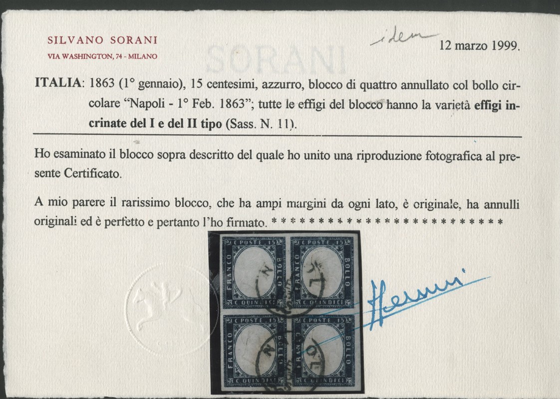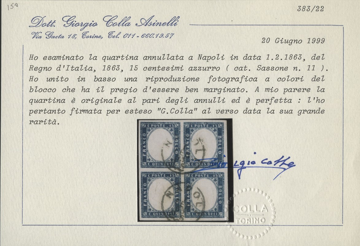 1863 - 15c azzurro tipo Sardegna, BL4 ottimamente marginato, annullato 'NAPOLI 1 FEB 63'. CF Colla e Sorani (Sassone 11 - Euro 42.500)