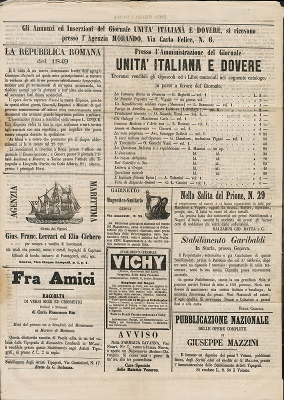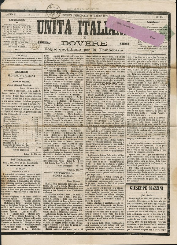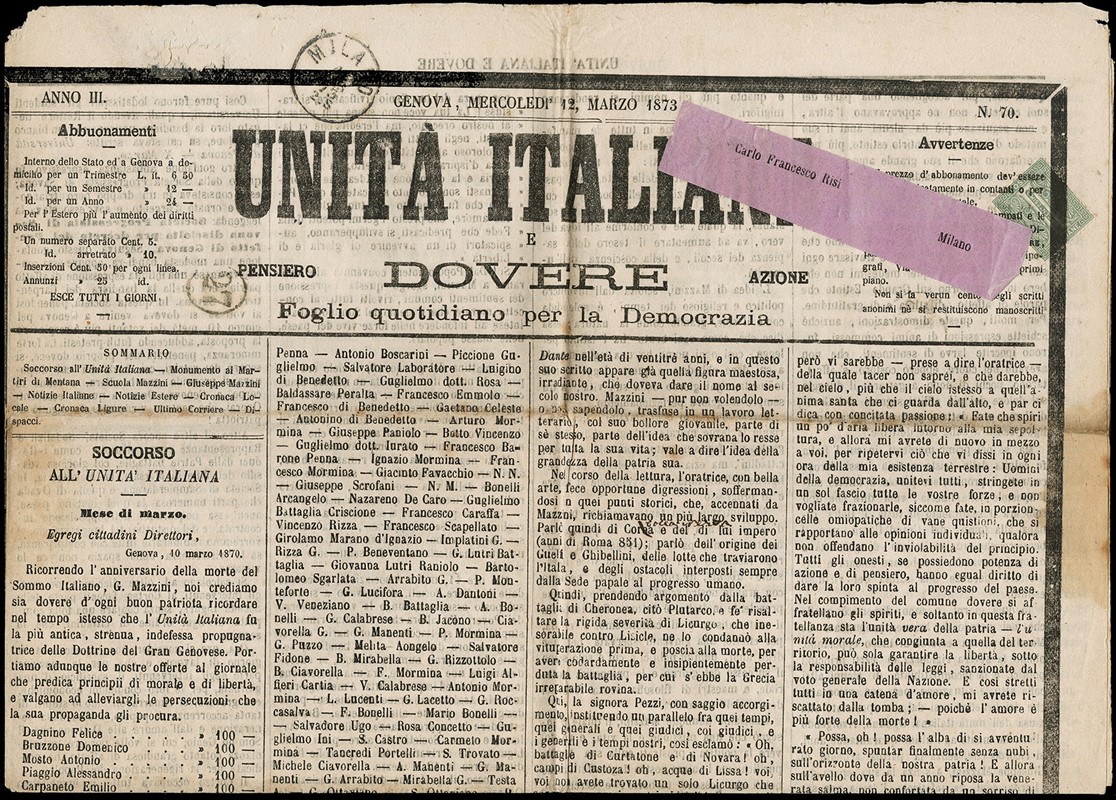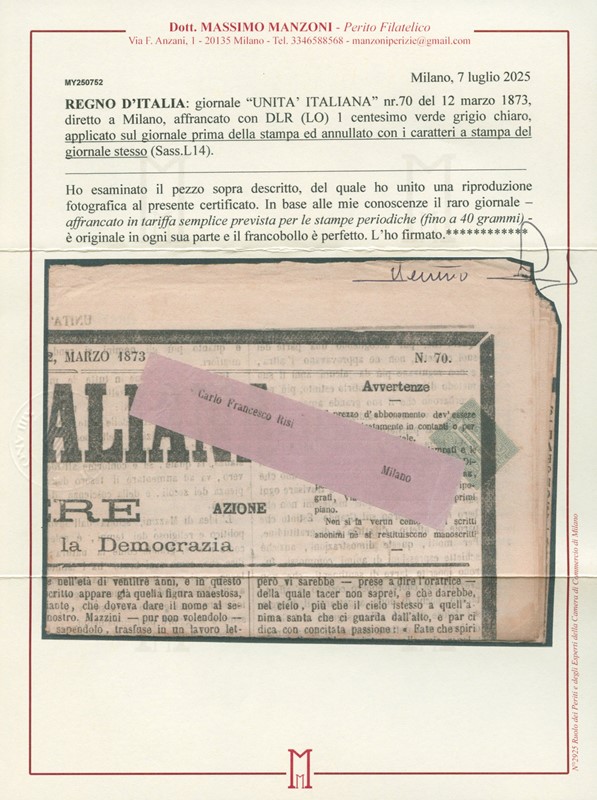 1863 - 1c verde grigio chiaro annullato a stampa tipografica, su giornale 'UNITA' ITALIANA' di Genova del 12 marzo 1873. CF Manzoni (Sassone L14 - Euro 12.500)