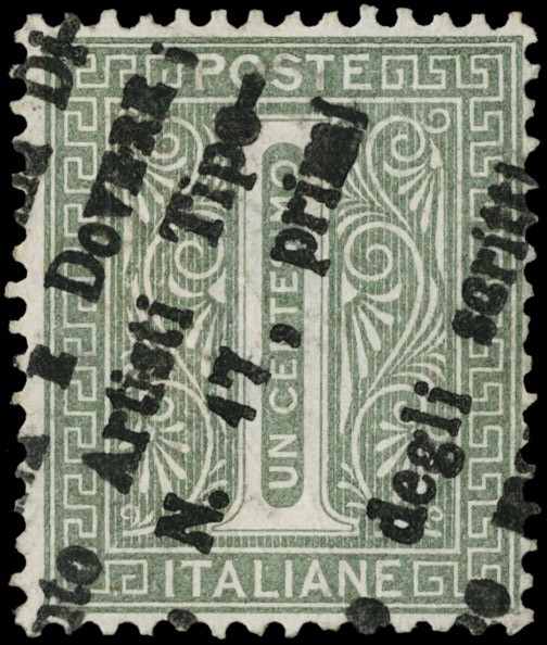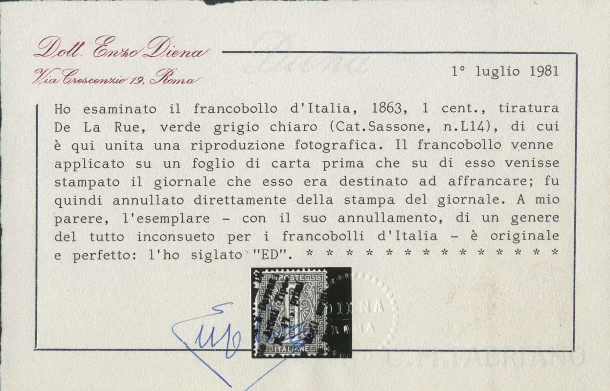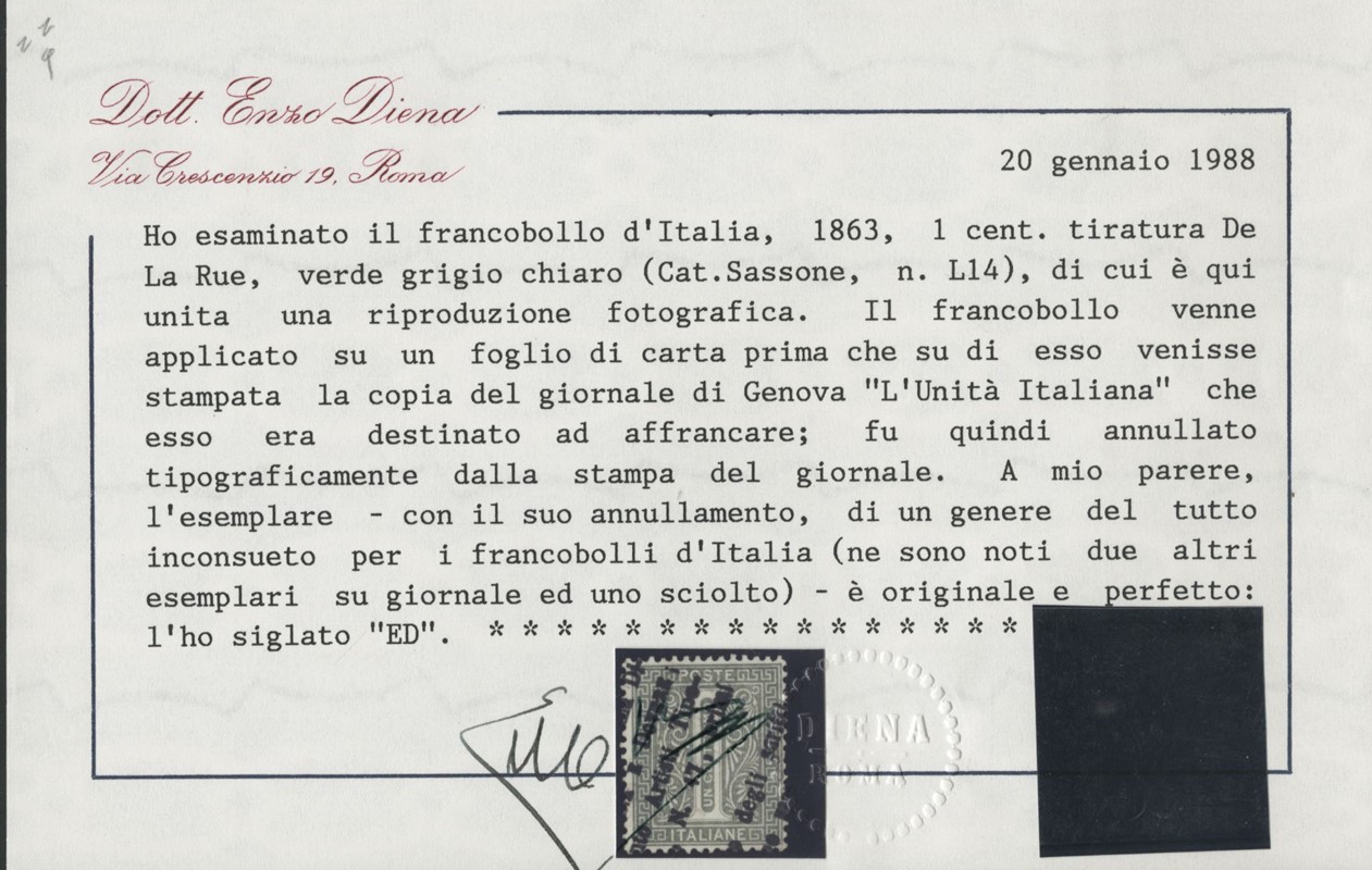 1863 - 1c verde grigio chiaro, DLR Londra, annullato a stampa. Firma Fiecchi e 2 CF E.Diena (Sassone L14 - Euro 2.500)