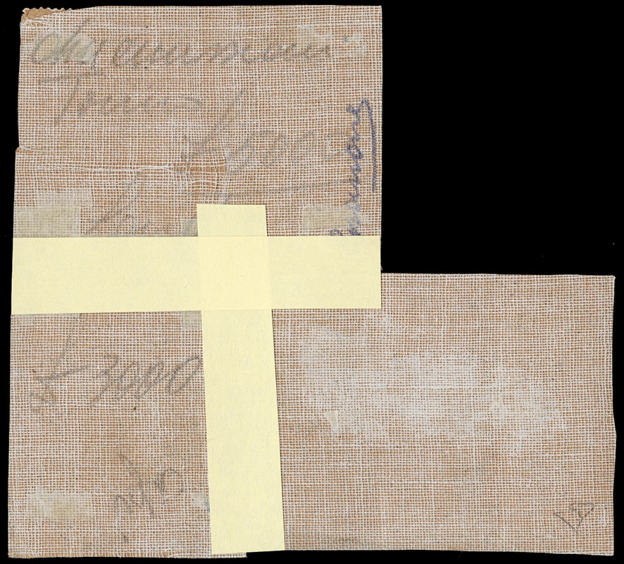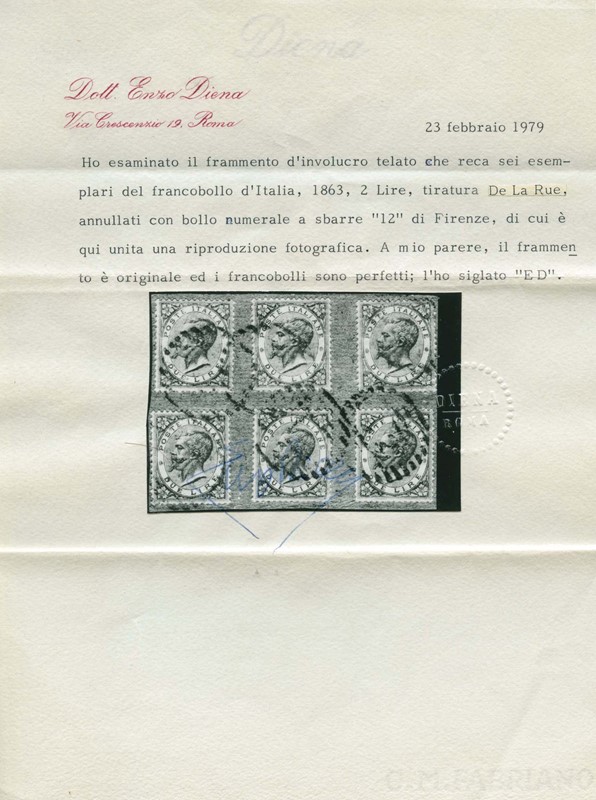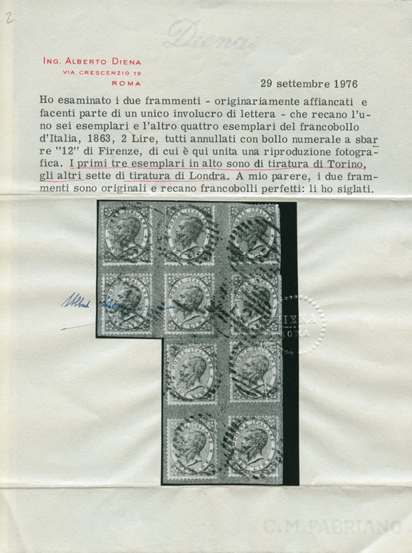1863 - 2L scarlatto, DLR Londra, 13 esemplari, e 2L scarlatto vivo, DLR Torino, tre esemplari, in affrancatura 'mista valori gemelli' su grande frammento di pacco postale, composto da tre frammenti riuniti. Unico multiplo noto delle due tirature. CF A. ed E.Diena (Sassone L22+T22 - Euro -)