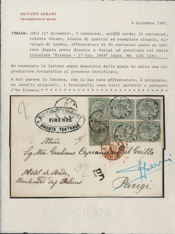 1863 - 5c grigio verde e 15c celeste chiaro, singolo e BL4, da 'FIRENZE 17 GIU 64' a Parigi. CF Sorani (Sassone L16+L18 - Euro 24.000+)