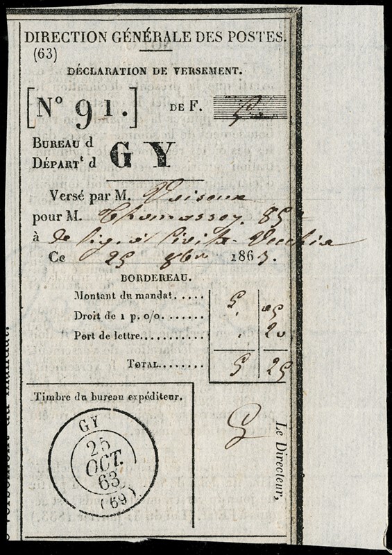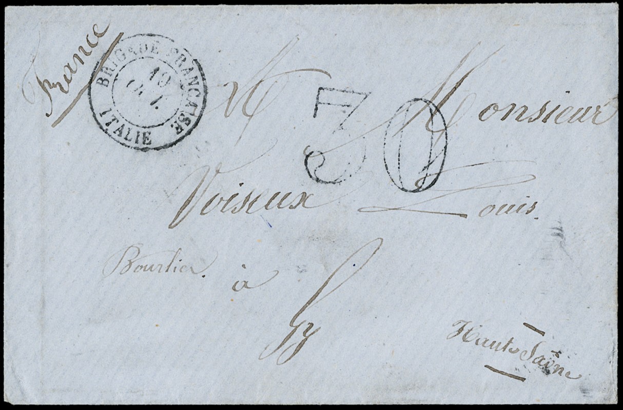 1863 - lettera non affrancata dalla 'BRIGADE FRANCAISE ITALIE 19 OCT.' (senz'anno) per GY, Francia, tassata '30'. All'interno ricevuta di un versamento di denaro effettuata a 'GY 25 OCT. 63' dal destinatario della lettera, verosimilmente a favore del mittente. Insieme raro e molto interessante (Sassone pt.13 su lettere non affrancate - Euro 9.000)