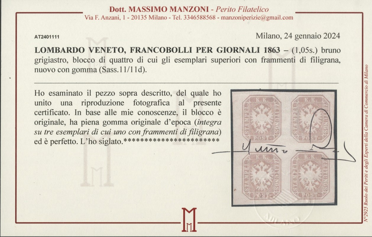 1863 - Testine (1,05s) bruno grigiastro, BL4 con i due esemplari superiori con frammenti di filigrana, SL. CF Manzoni (Sassone 11/11d - Euro 3.500+ filigrana)