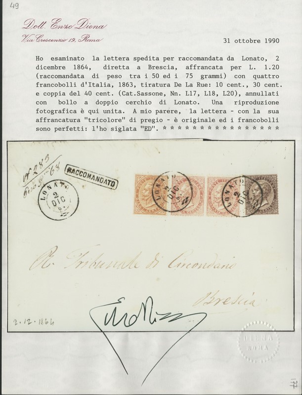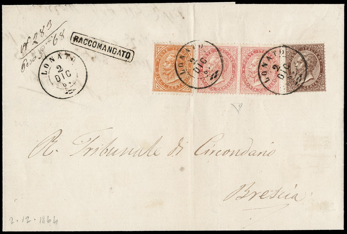 1864 - 10c ocra arancio, 30c bruno e 40c rosa carminio, coppia orizzontale, tutti DLR Londra, in affrancatura tricolore da 1,20 lire su raccomandata da 'LONATO 2 DIC 64' per Brescia. Piega verticale d'archivio sulla lettera, che non interessa i francobolli. Insieme splendido e non comune. CF E.Diena (Sassone L17+L19+L20 - Serra Zanaria 1997 Lit 4.800.000)