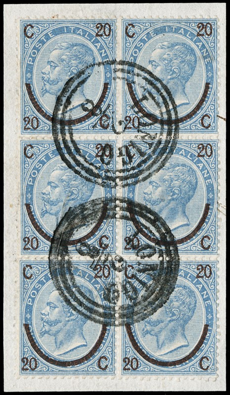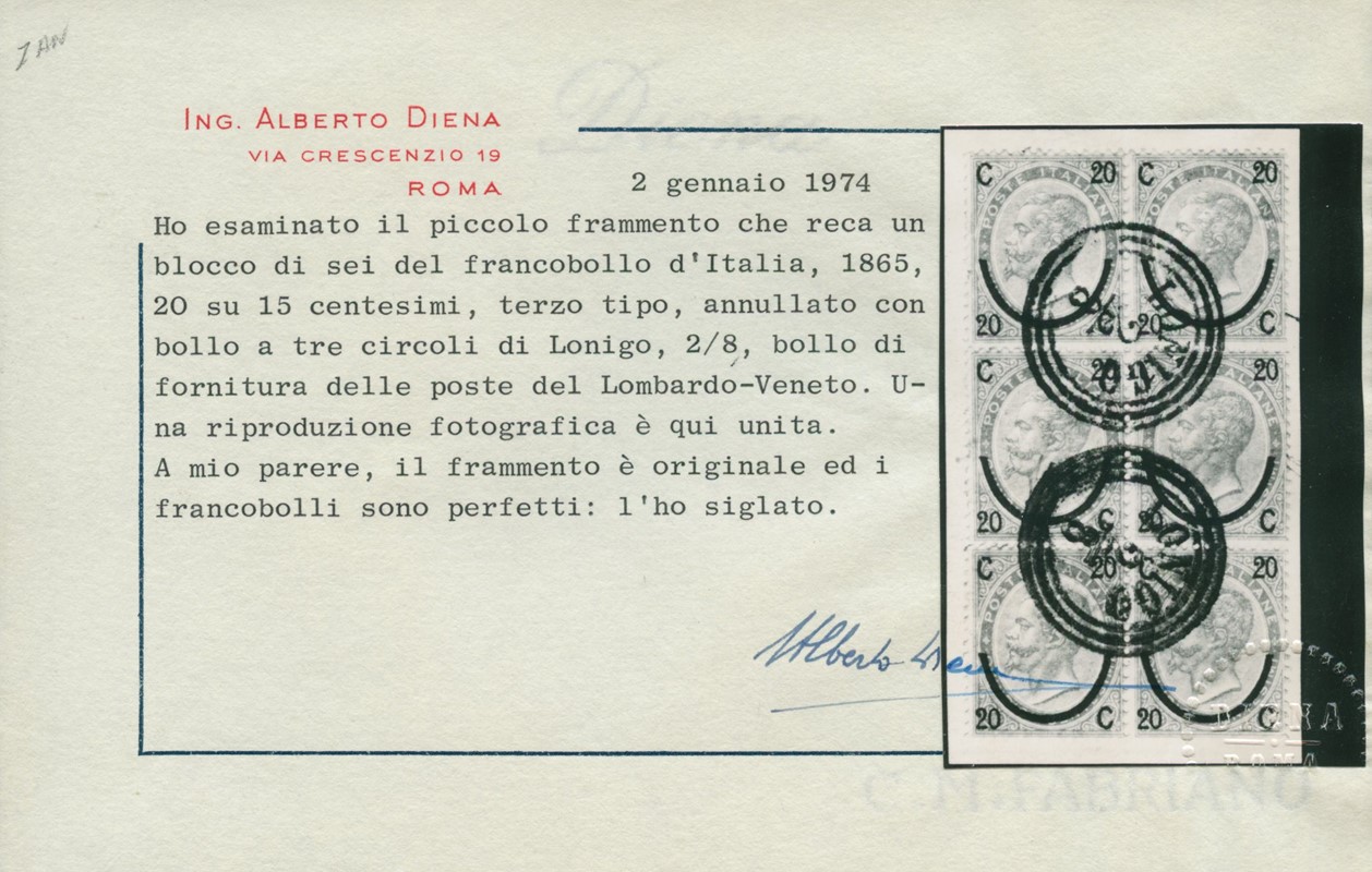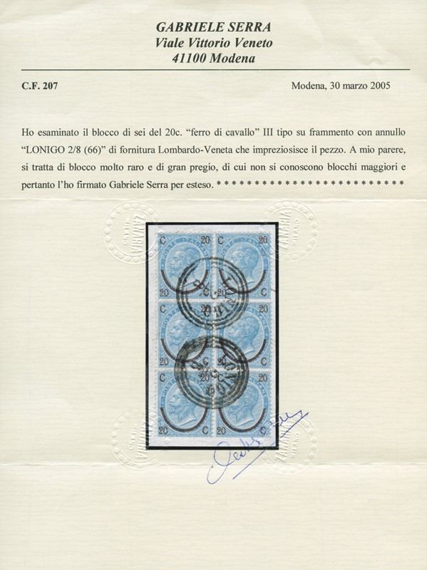 1865 - Regno d'Italia, 20c su 15c celeste ferro di cavallo III tipo, blocco verticale di sei annullato 'LONIGO 2/8' (1866) (C3 di fornitura austriaca). Uno dei due blocchi noti, unico usato tra il 1 e il 12 agosto 1866. CF A.Diena e Serra (Sassone 25 - Euro 10.700+++)