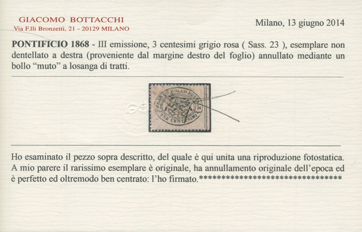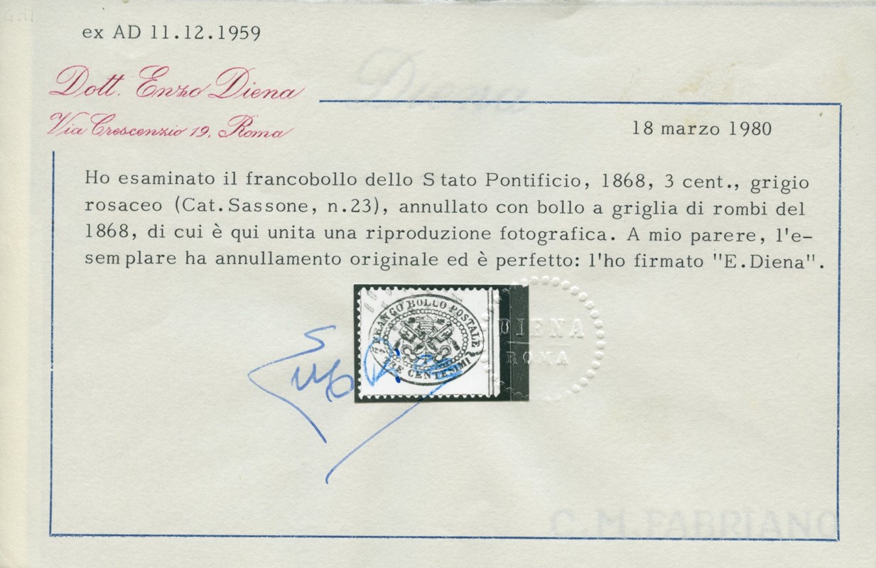 1868 - 3c grigio rosa, BdF destro, annullato a griglia. Raro e splendido, CF Bottacchi ed E.Diena (Sassone 23 - Euro 31.500)