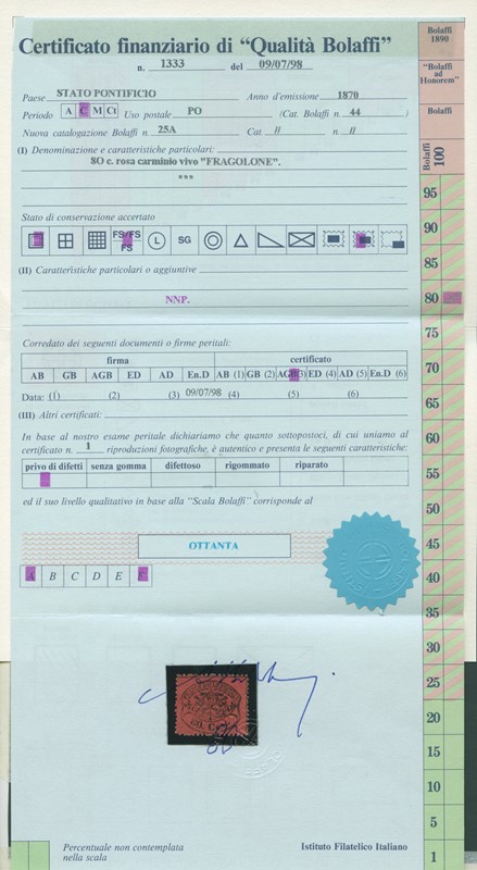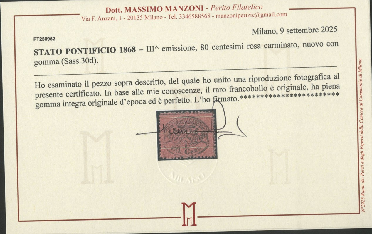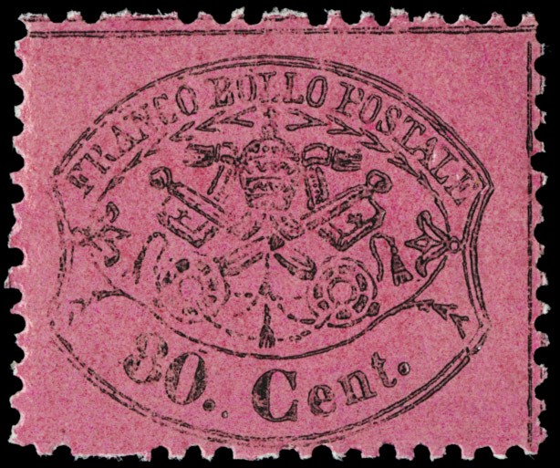 1868 - 80c rosa carminato 'fragolone', con gomma integra. Raro e splendido. CF finanziario Bolaffi 80% e Manzoni (Sassone 30d - Euro 30.000)