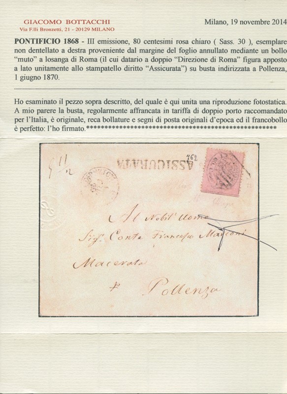 1868 - 80c rosa chiaro, uso isolato su 'ASSICURATA' da 'DIREZIONE DI ROMA 1 GIU 70' per Pollenza. Raro uso isolato di questo valore. Firme A. ed E.Diena, CF Bottacchi (Sassone 30 - Euro 8.000)