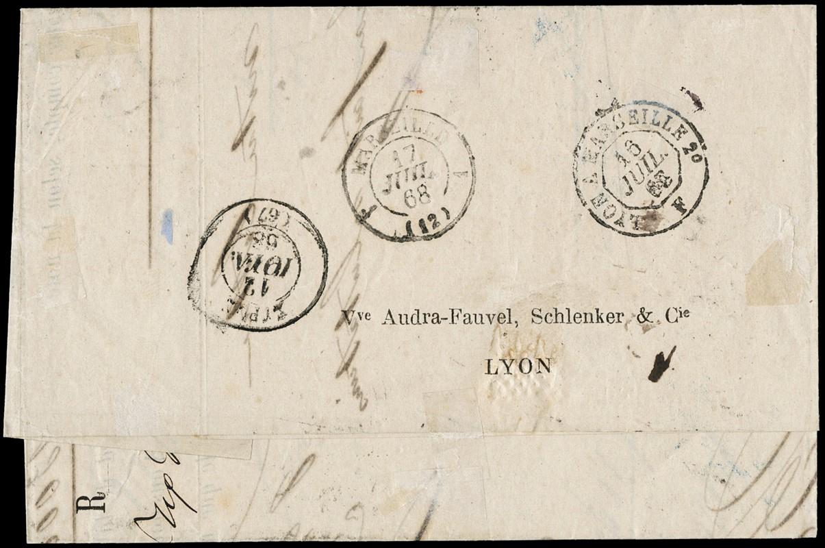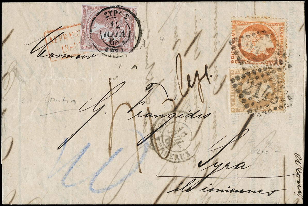 1868 - Grandi teste di Hermes, Francia Napoleone laureato 10c bistro e Napoleone III 40c arancio annullati grandi cifre '2145' su lettera insufficientemente affrancata da 'LIONE 16 JUIL 68' a Syra, tassata in arrivo con tirature successive di Atene 1862-67, 40 lepta rosa-grigiastro su grigio-lilla annullato 'SYROS 12.07.68' . Piega d'archivio sul 10c e francobollo di Grecia corto in alto, insieme comunque interessante (Yvert 22A + Francia 23+28 / Hellas 20II)