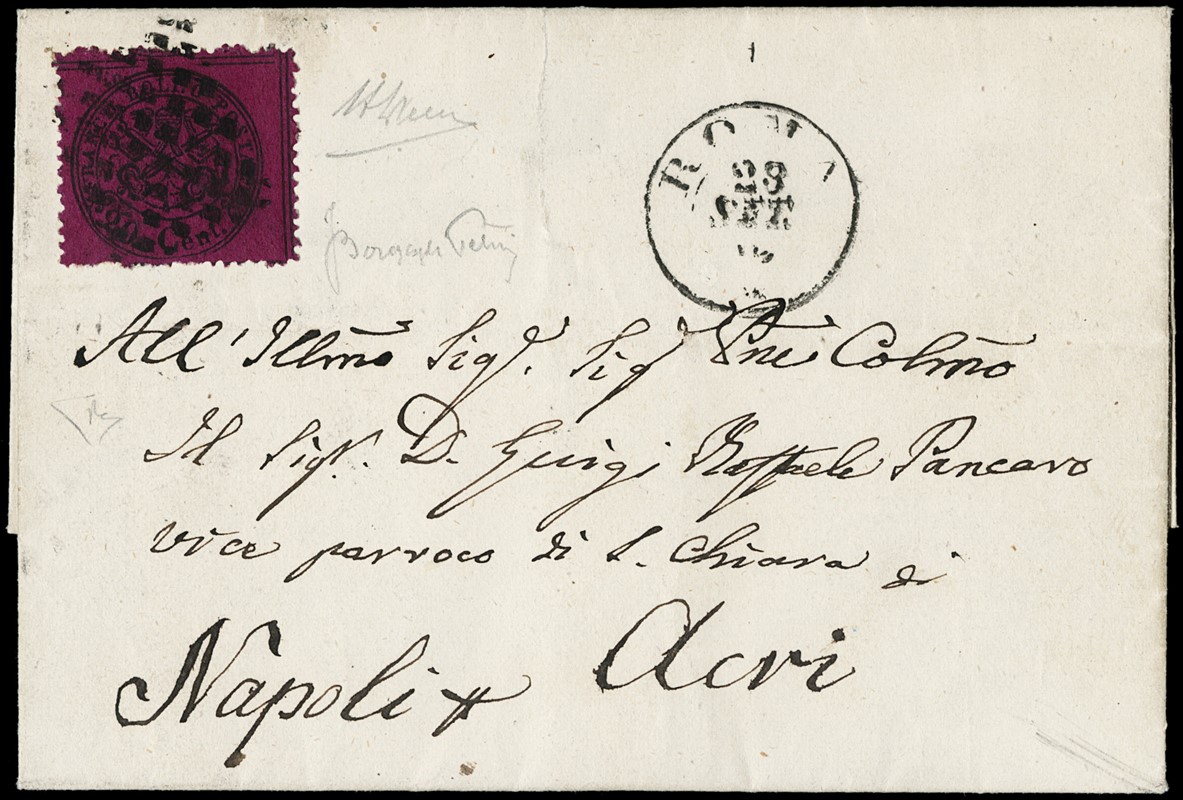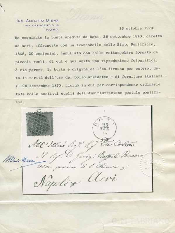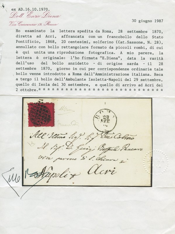 1870 - 20c solferino annullato con muto a rombi di fornitura italiana nel giorno della sua introduzione ufficiale da 'ROMA 28 SET 70', per Acri. Al verso ambulante 'ISOLETTA NAPOLI 29 SET 70'. Firma Bargagli, CF Alberto ed E.Diena. Ex collezione Provera (Sassone 28 - Euro -)