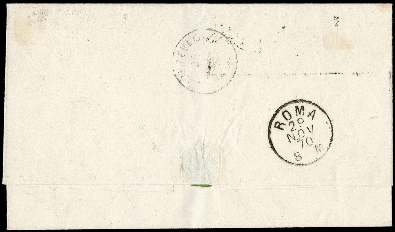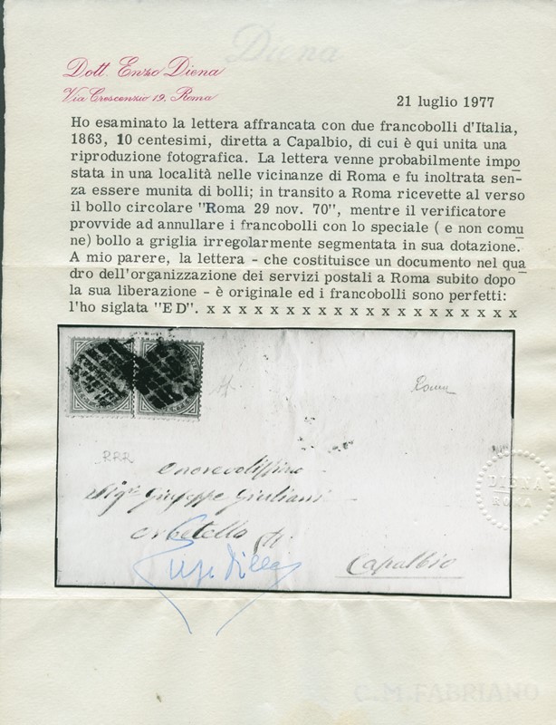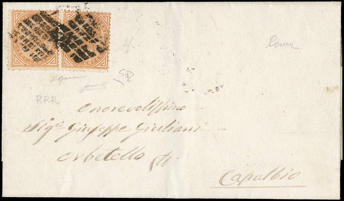 1870 - Regno d'Italia, 10c giallo ocra, DLR Torino, due esemplari su lettera per Capalbio da una localita' del circondario di Roma sprovvista di bollo nominativo e annullati con la speciale griglia dell'uffiicio del Circondario di Roma. Al verso 'ROMA 29 NOV 70' in transito. Rara. Firma A.Diena, Gazzi e CF E.Diena. (Sassone T17 - Unificato Euro 3.000++)