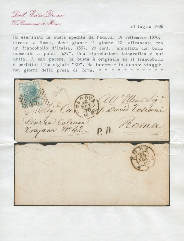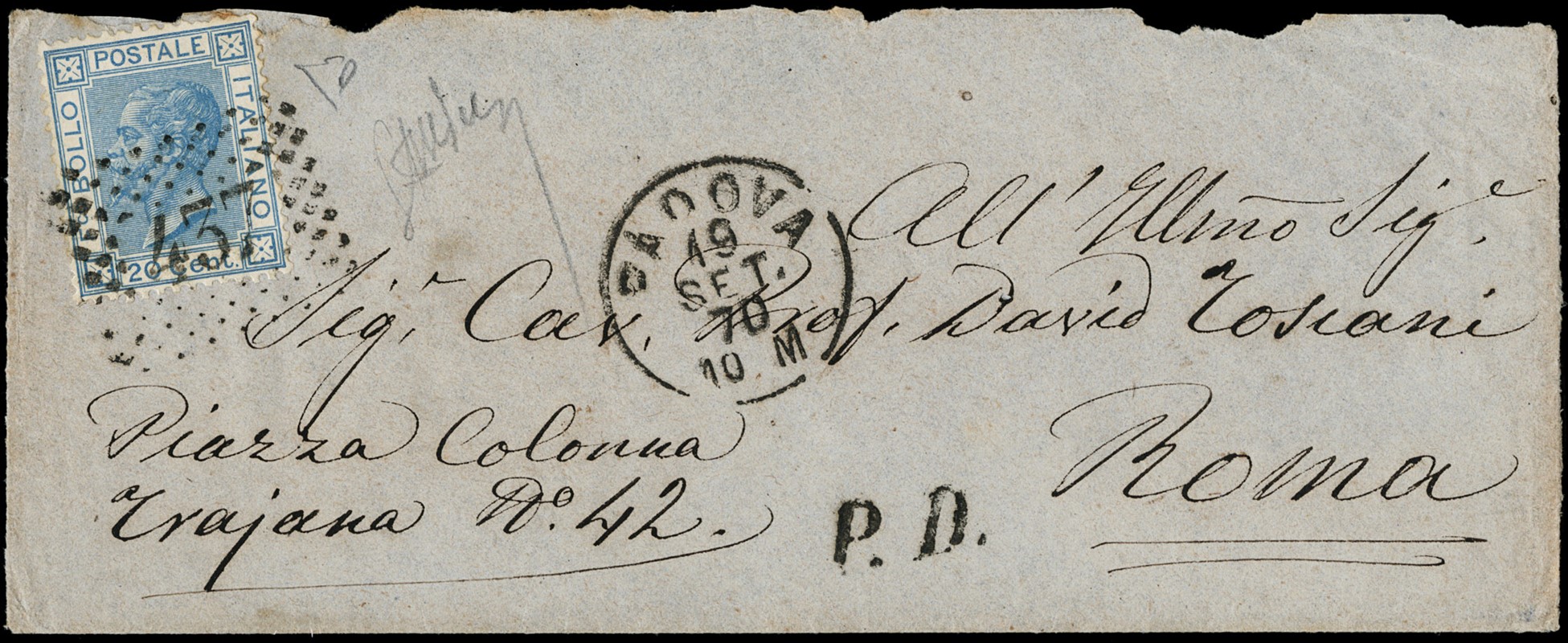 1870 - Regno d'Italia, 20c azzurro Bigola, tir. Torino, annullo numerale a punti '437' da 'PADOVA 19 SET. 70' per Roma, con ingresso in 'ROMA 22 SET 70', il giorno successivo la presa della citta'. CF E.Diena (Sassone T26 - Euro -)