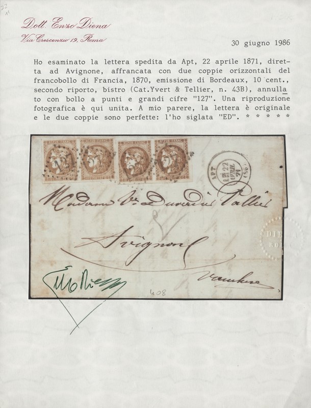 1871 - Francia: emissione di Bordeaux 10c bistro II riporto, due coppie orizzontali di sfumature di colore differenti, da 'APT 22 AVRIL 71' ad Avignone. Ex Provera, CF E.Diena (Yvert 43B)