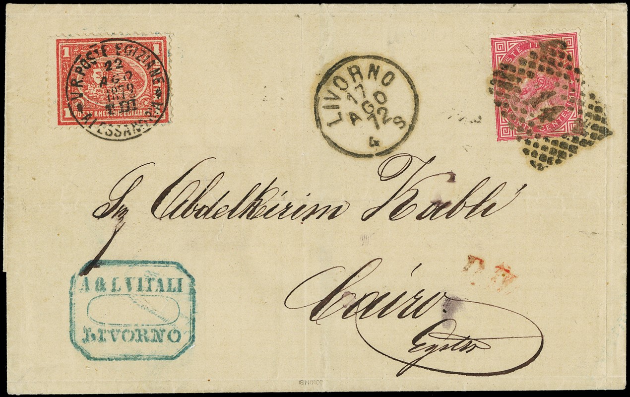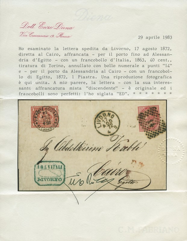 1872 - 40c carminio, DLR Torino, con Egitto 1p carminio, mista discendente da 'LIVORNO 17 AGO 72' per Il Cairo, Egitto. CF E.Diena (Sassone T20 + Egitto GI14 - Euro -)