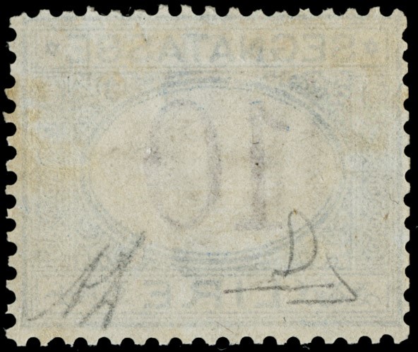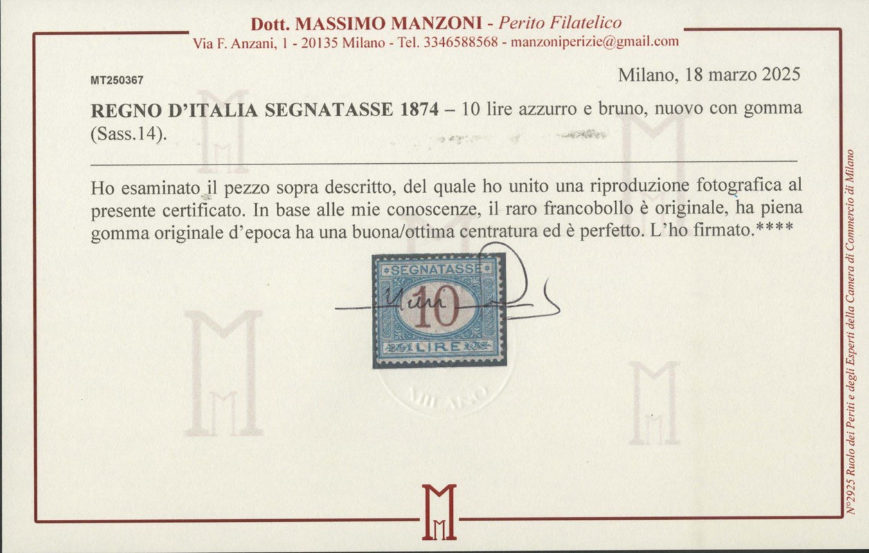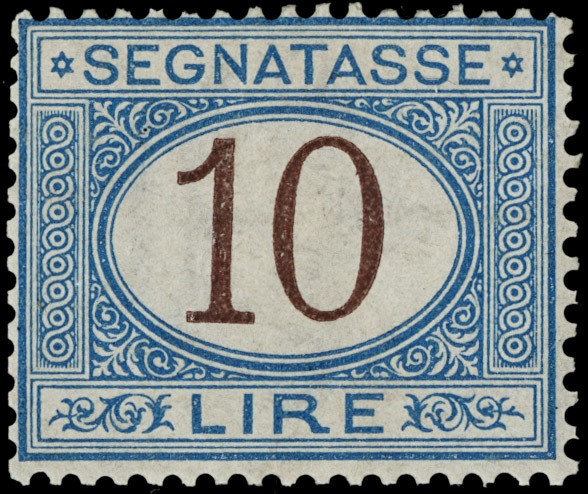 1874 - 10L azzurro e bruno, buona/ottima centratura. Molto raro in queste condizioni. Sigla A.Diena, CF Manzoni (Sassone T14 - Euro 20.000++)