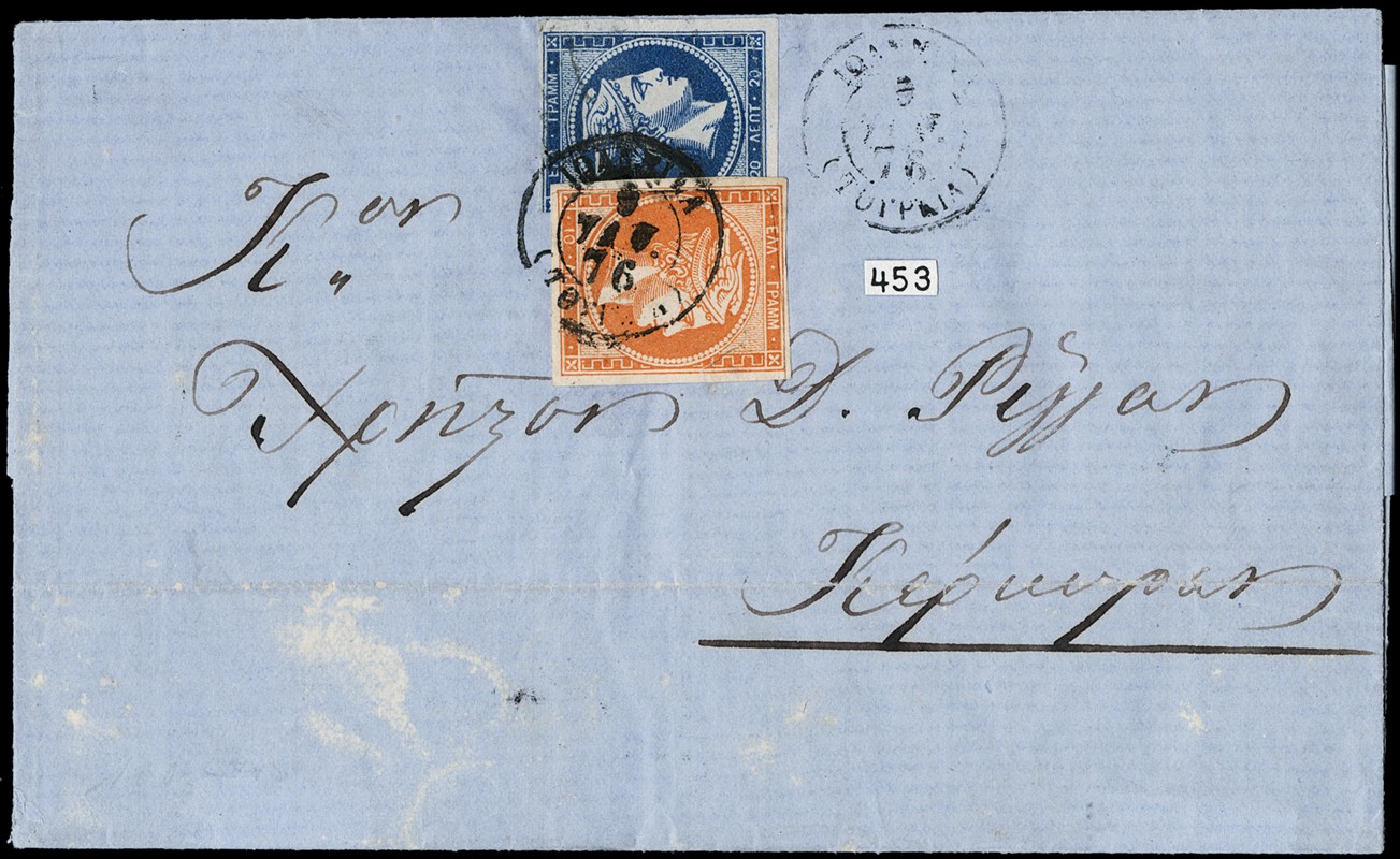 1876 - Grandi teste di Hermes, 10 lepta rosso-arancio “lastre ripulite' e 20 lepta 'carta di qualita' inferiore - 1871/72', esemplare difettoso, recuperato da una precedente affrancatura, da 'IOANNINA (Turchia) 9 JAV. 76' per Corfu', con arrivo il 12 gennaio. Interessantissima frode postale in uffici all'estero (Yvert 27+21 / Hellas 26+35)