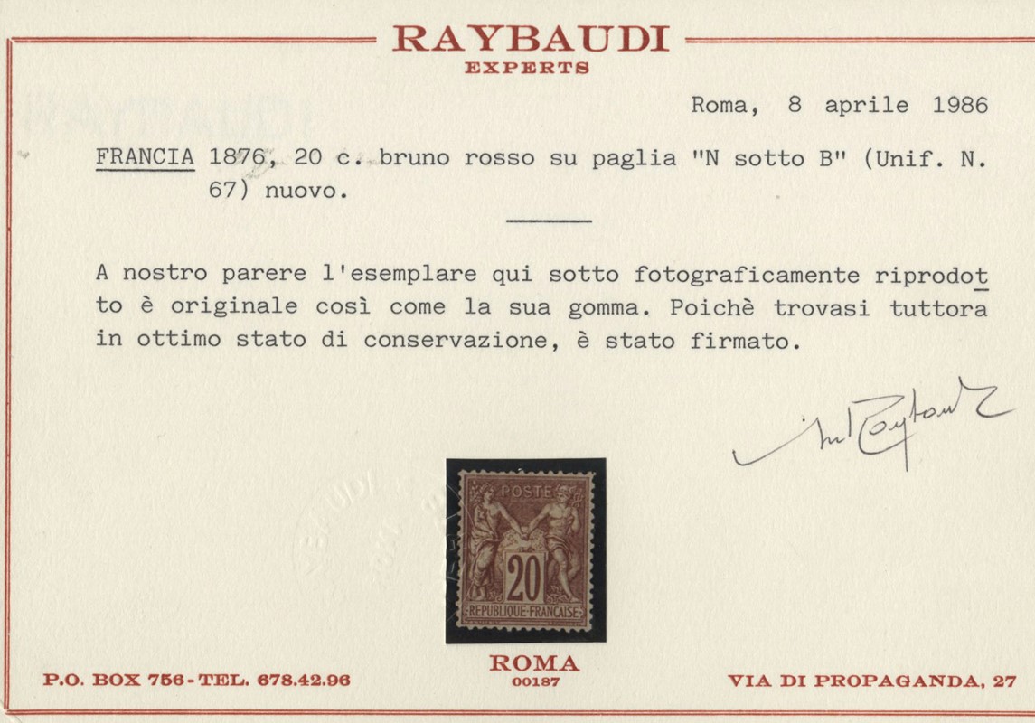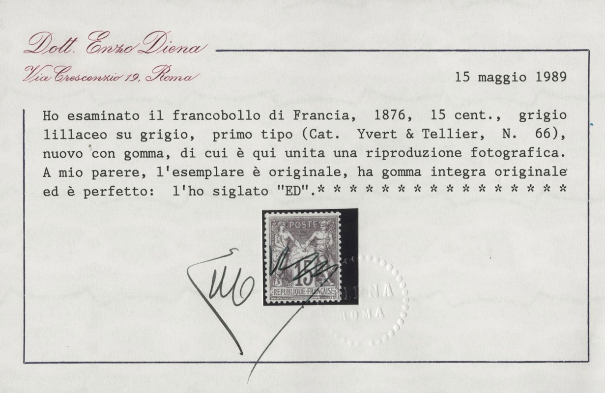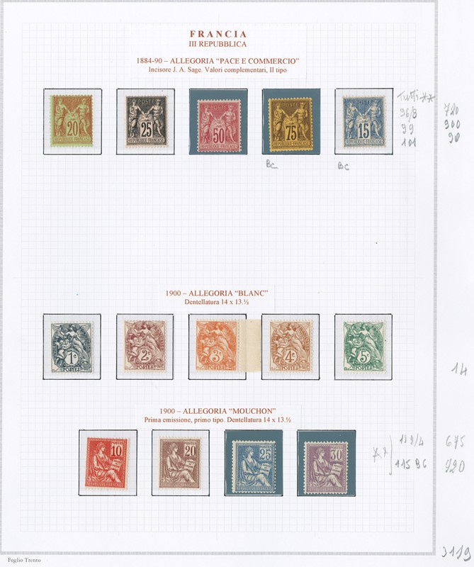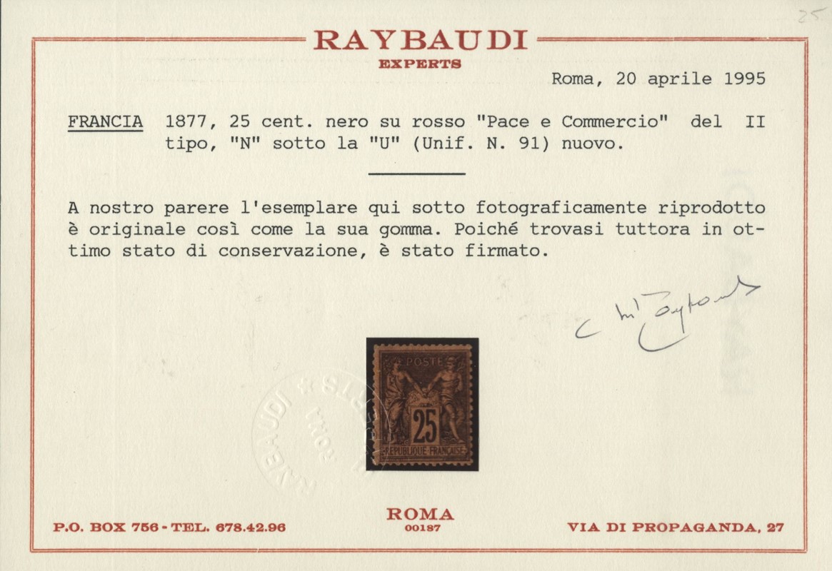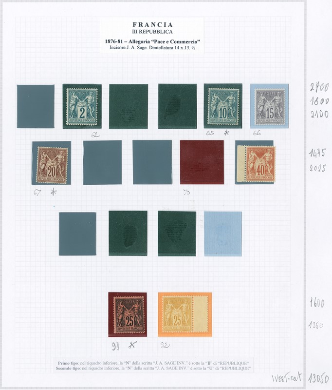 1876/78 - FRANCIA: Pace e Commercio, insieme di francobolli nuovi di buona/ottima centratura composto da I tipo: 2c SL, 10c TL ben centrato, 15c SL, 20c ben centrato, 40c SL ben centrato. Secondo tipo: 25c nero su rosso TL e 25c bistro su giallo SL, come 96/99 + 101 +107/111 + 112/115. Cinque CF (Yvert 62 + 65/7+70 + 91/92+96/99+101 +107/111+112/115 - oltre Euro 16.000)