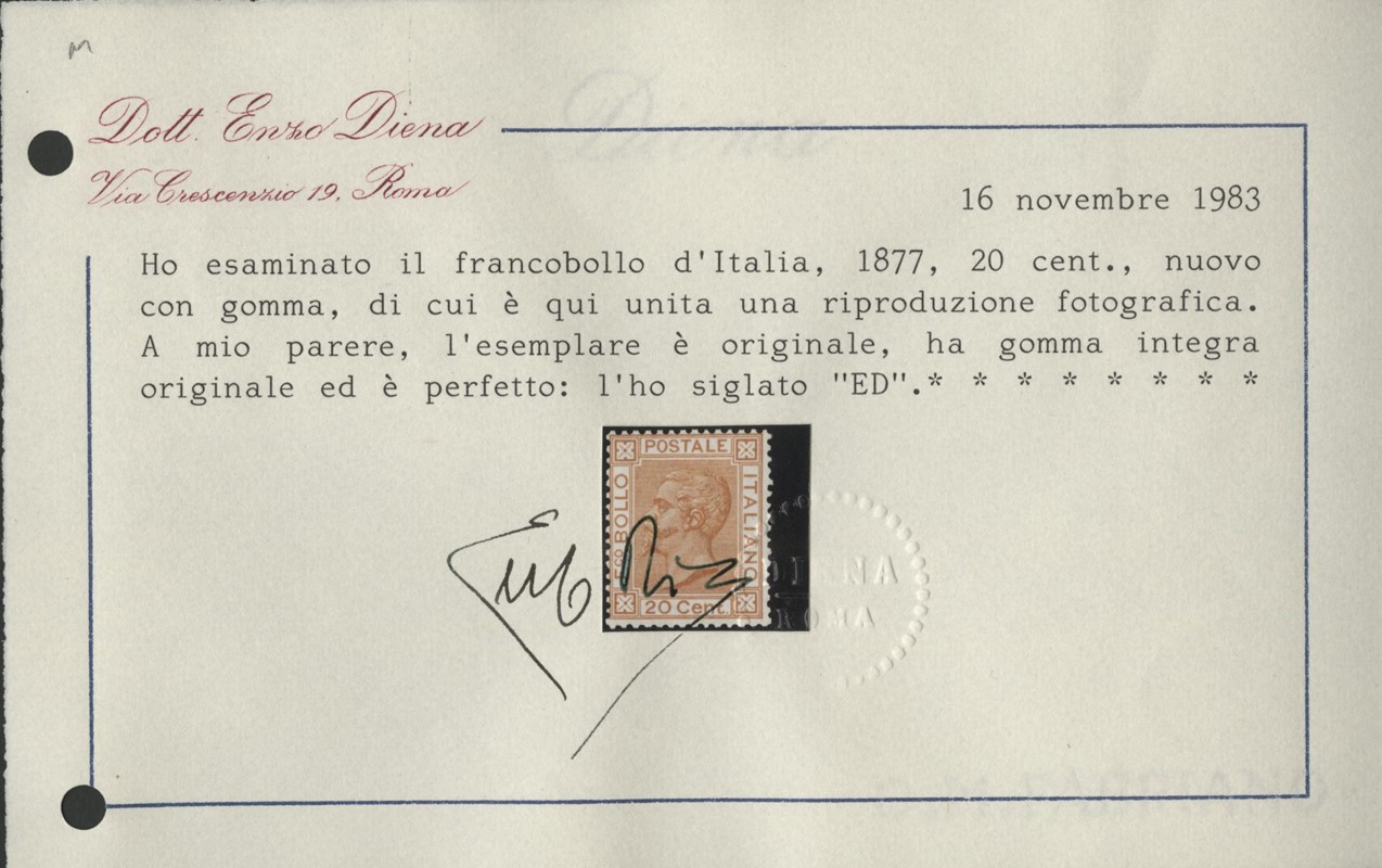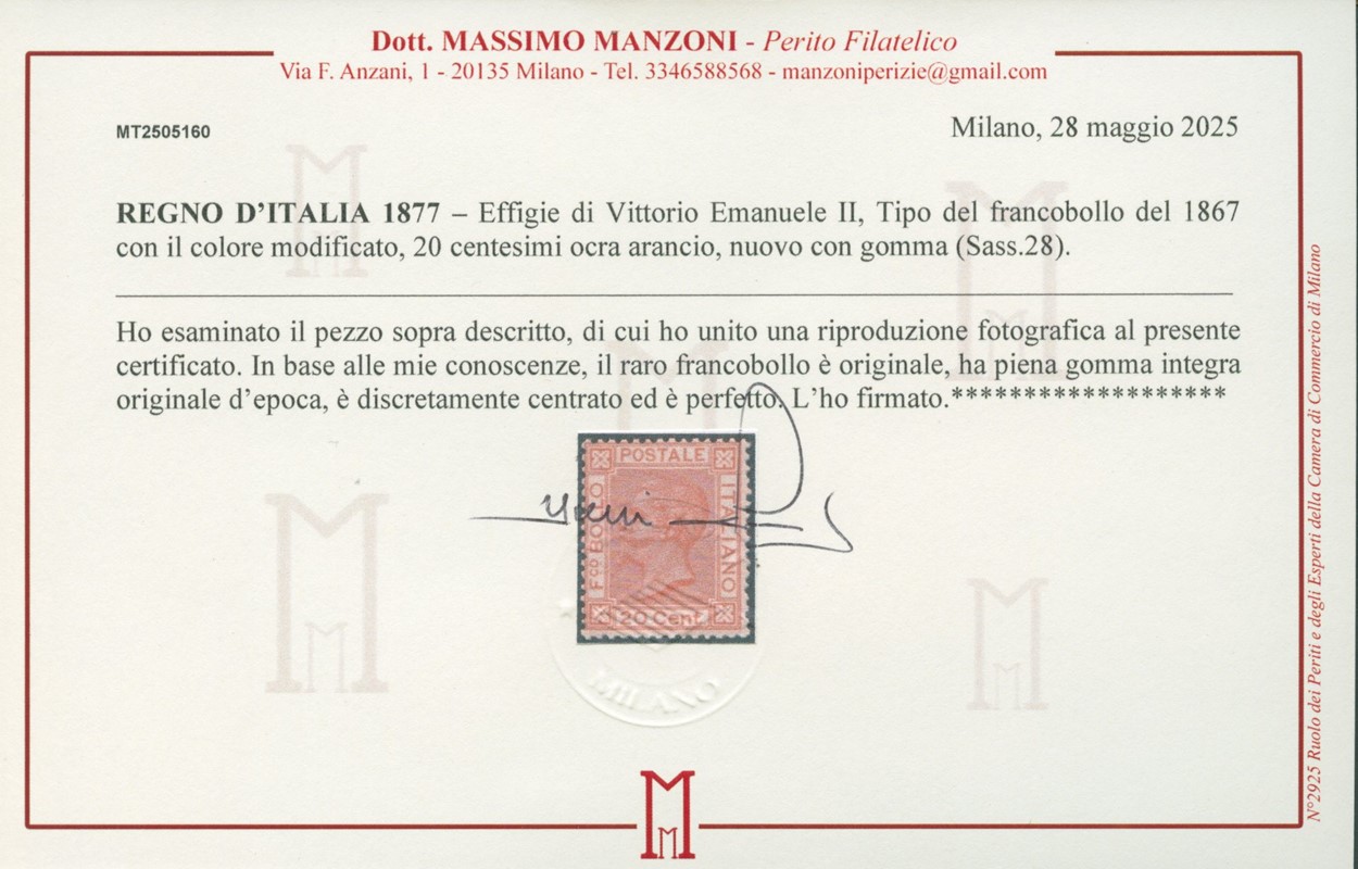 1877 - 20c ocra arancio, discreta centratura, SL. CF E.Diena e Manzoni (Sassone 28 - Euro 17.500)
