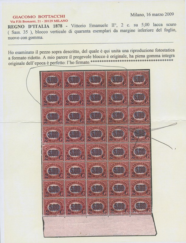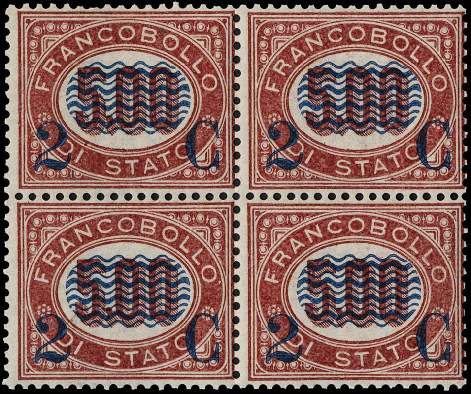 1878 - Servizi soprastampati, 2c su 5L lacca scuro, BL4, discreta centratura e SL. CF Bottacchi (fotocopia) (Sassone 35 - Euro 13.000 come sciolti)