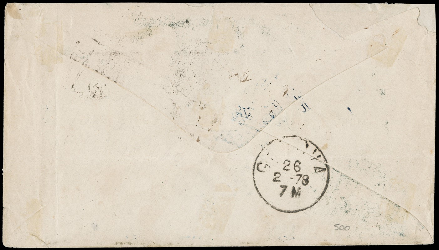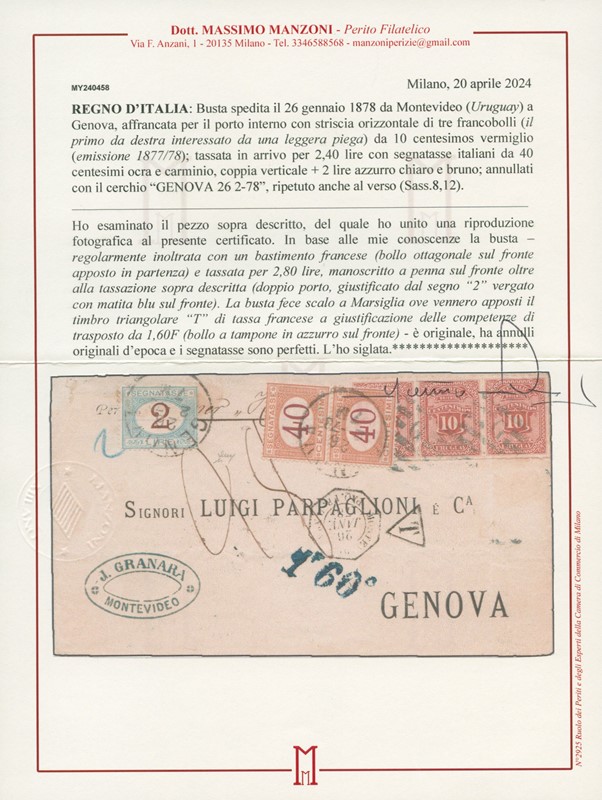 1878 - Uruguay, 10c carminio, emissione 1877/78, ST3 annullata ovale a sbarre 'G' in azzurro, su lettera da Montevideo per l'Italia, tassata in arrivo a 'GENOVA 20/2/78' con segnatasse d'Italia 40c ocra e carminio, coppia verticale, e 2L azzurro chiaro e bruno. Splendida e non comune. CF Manzoni (Sassone T8+T12 - Euro - )