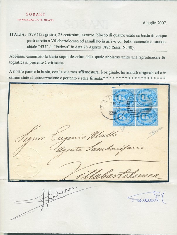 1879 - Umberto 25c azzurro, BL4 annullato con numerale a sbarre '437' da 'PADOVA 28 AGO 85' a Villabartolomea. Raro. CF Sorani (Sassone 40 - Euro 13.000)
