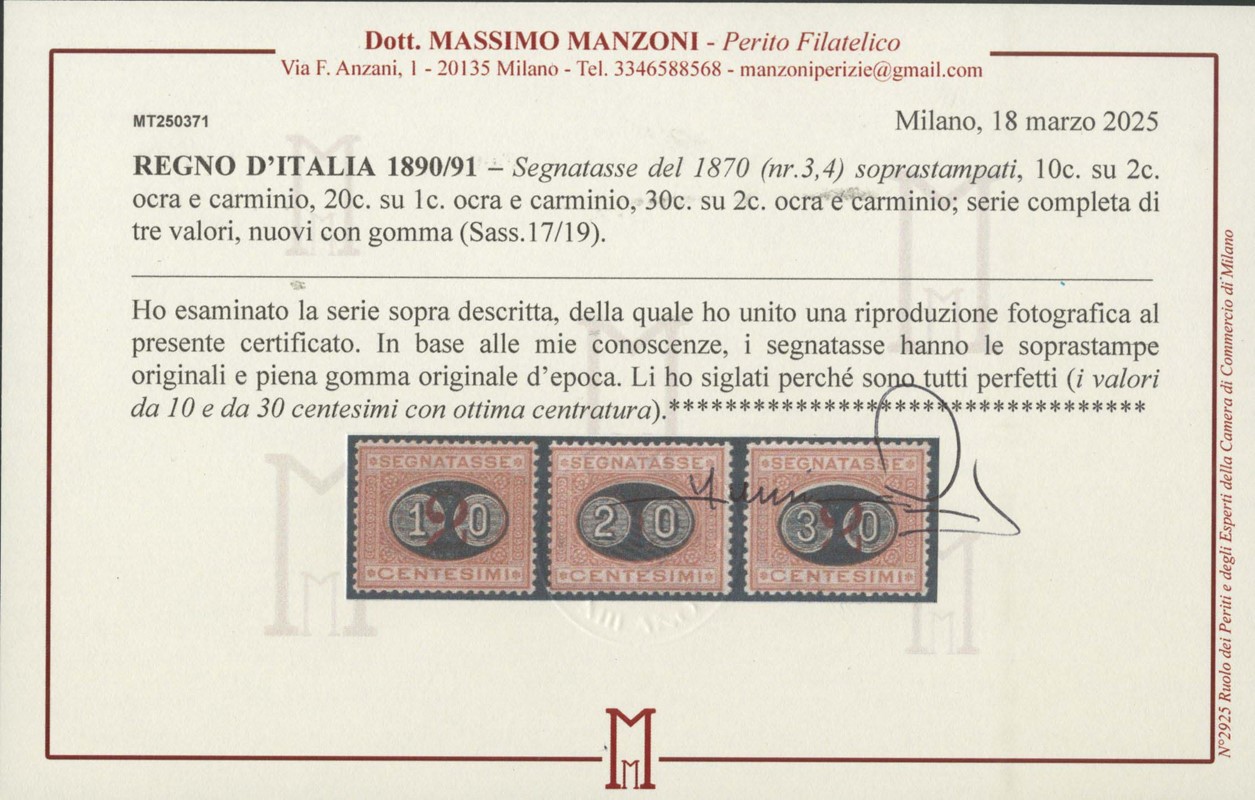 1890/91 - Mascherine, la serie di tre valori. Ottima centratura per il 10c e il 30c. Sigla E.Diena, CF Manzoni (Sassone T17/19 - Euro 10.400)